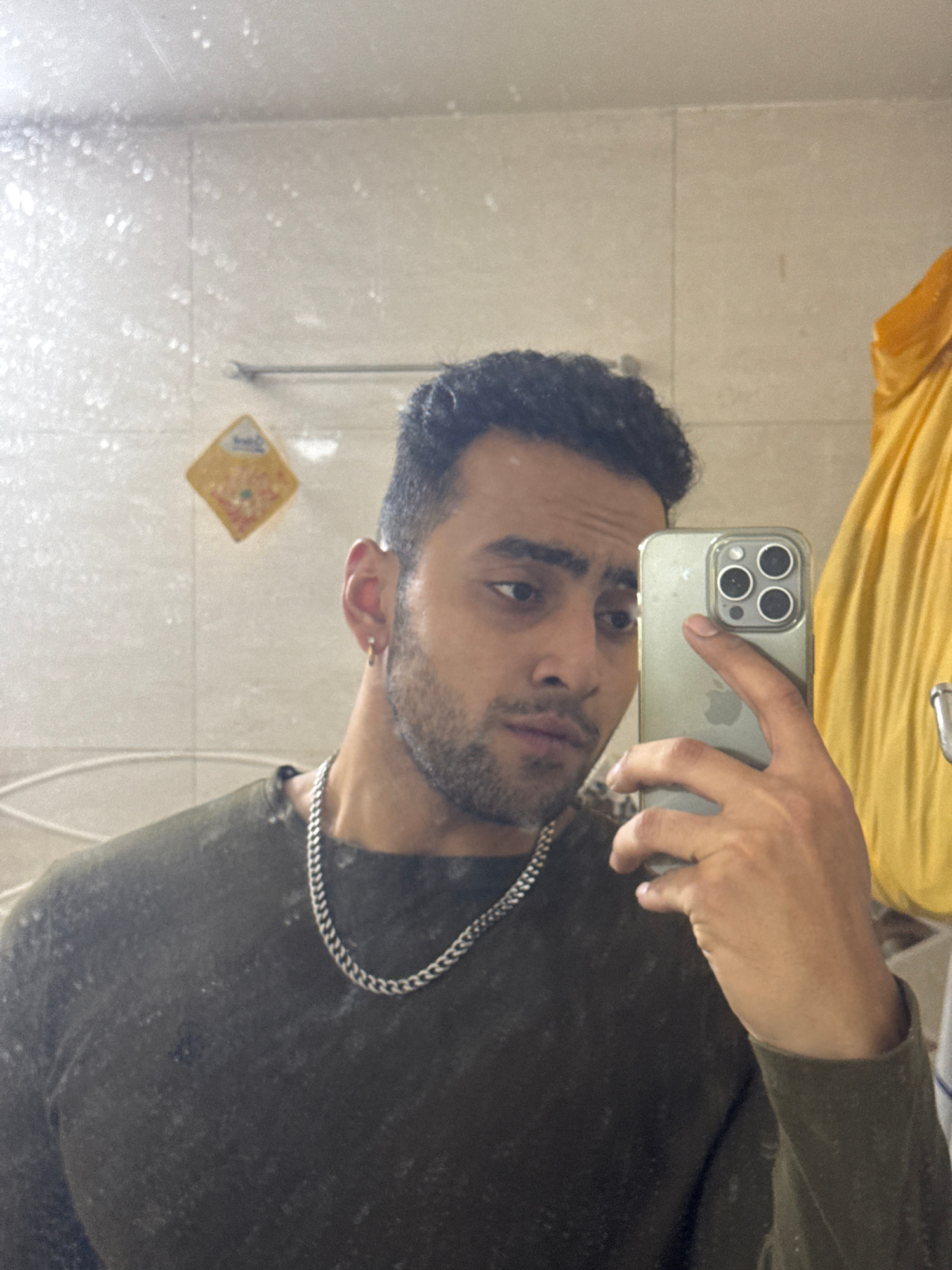 The image shows a man with dark hair and a beard taking a selfie in a bathroom mirror. He is wearing a dark green shirt and a silver chain necklace. He is holding an iPhone in his hand, and his reflec…read more