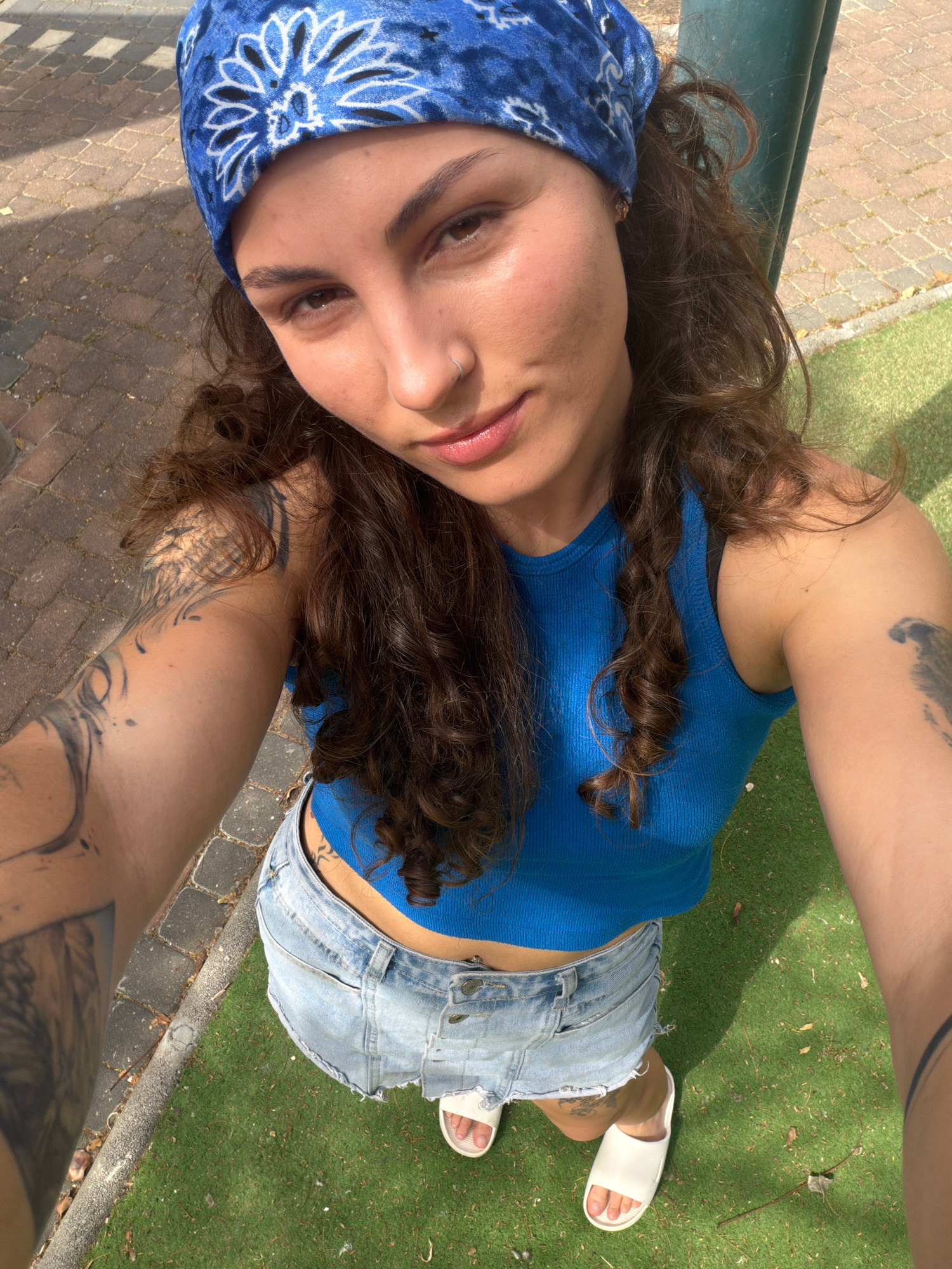 A young person, likely female, is captured in a high-angle, low-perspective selfie, seemingly reclining or lying down outdoors in Kiryat Motzkin, Israel. She looks directly at the camera with a relaxe…read more