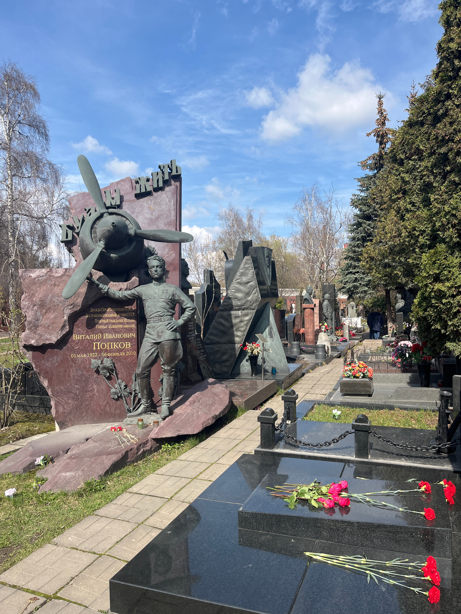 The image shows a monument at the Novodevichy Cemetery in Moscow, Russia. The monument is dedicated to Vitaly Ivanovich Popkov, a decorated Soviet military aviator and twice Hero of the Soviet Union.…read more