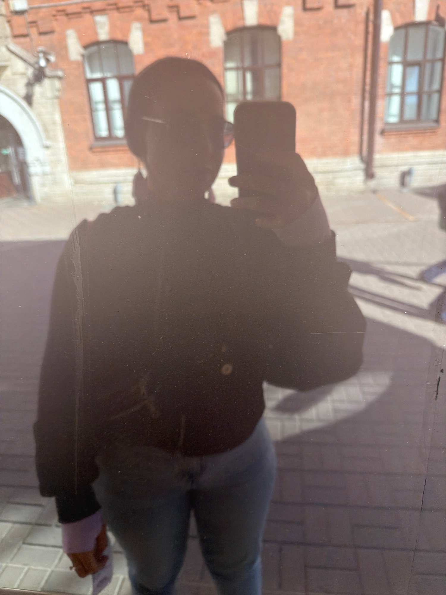 The image depicts a person reflected in a window while holding a phone to take a picture. The reflection shows a red brick building with arched windows, a brick-paved sidewalk, and the person wearing…read more
