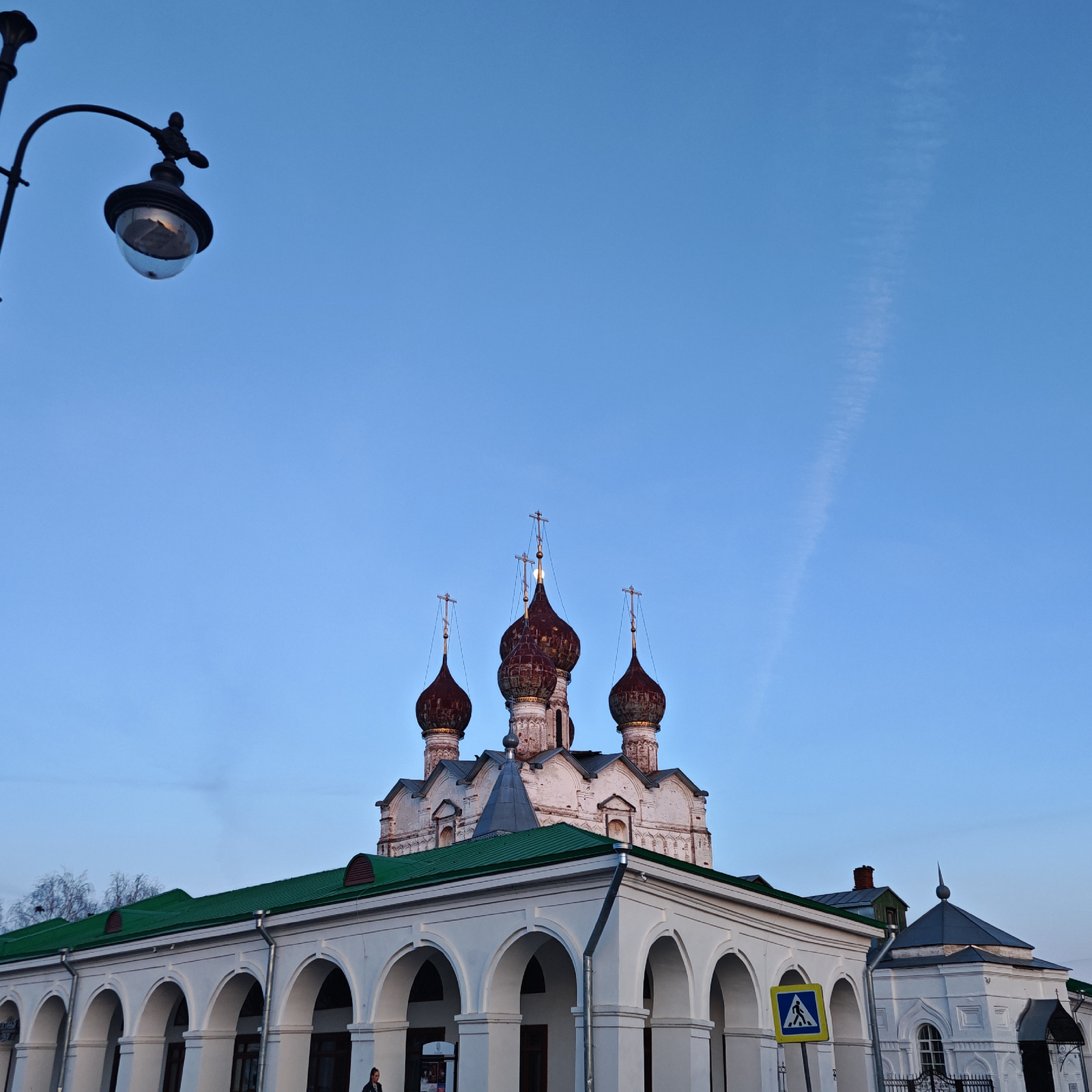 A low-angle shot depicts a white building with arched columns and a green roof in Rostov, Russia, partially obscuring a church with ornate, reddish-brown onion domes topped with crosses. A lamppost is…read more