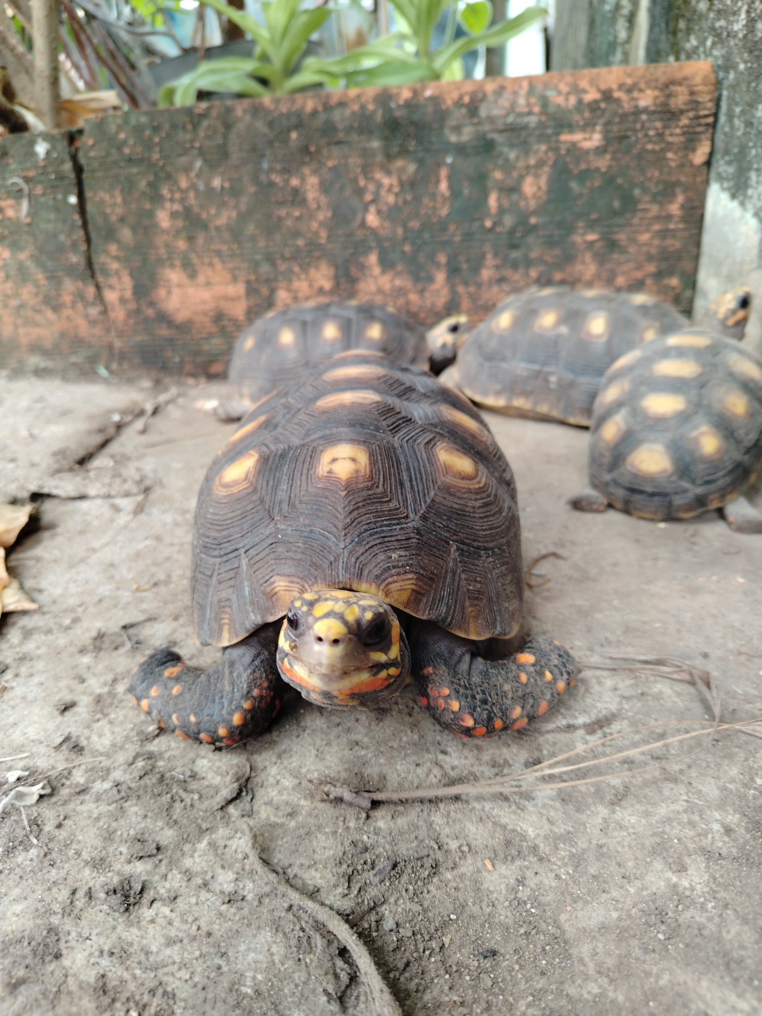 The image shows four red-footed tortoises in what appears to be a garden in Tinaquillo, Venezuela. The tortoises are on a concrete surface with dirt and debris. In the background is a brick wall cover…read more