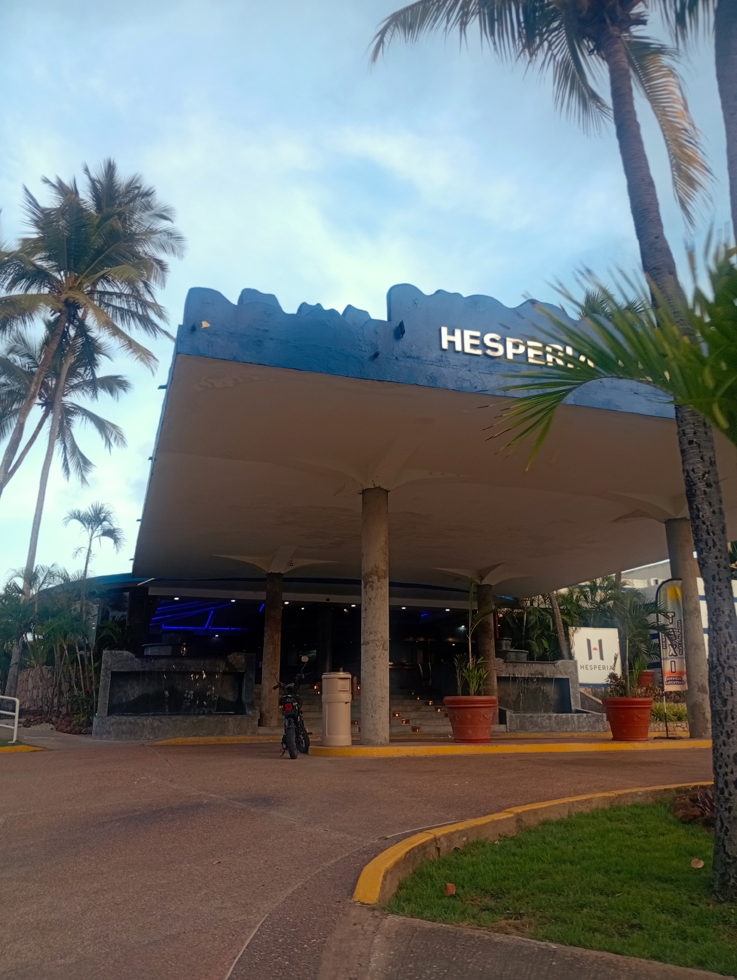 The image depicts the entrance to the Hesperia Playa El Agua hotel in Playa El Agua, Venezuela. The building has a distinctive, modern architectural style with a large, flat overhanging roof supported…read more