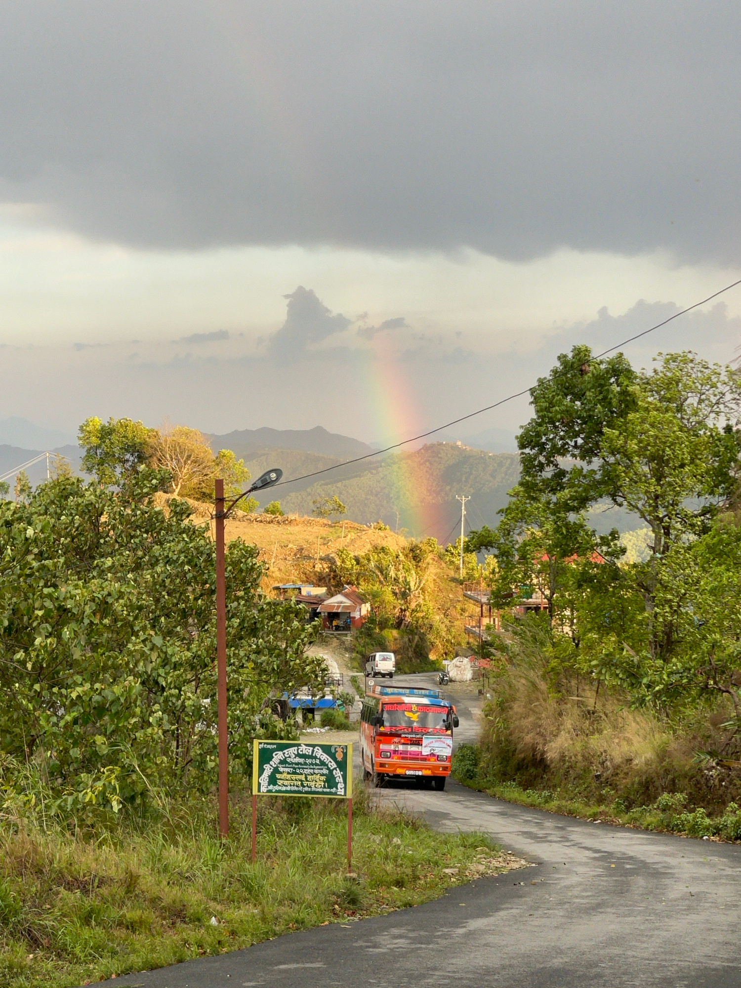 A road scene in Pokhara, Nepal, shows a rainbow arcing over a mountain landscape under a cloudy sky. A road curves to the right, with green foliage on either side. An orange bus is visible further dow…read more