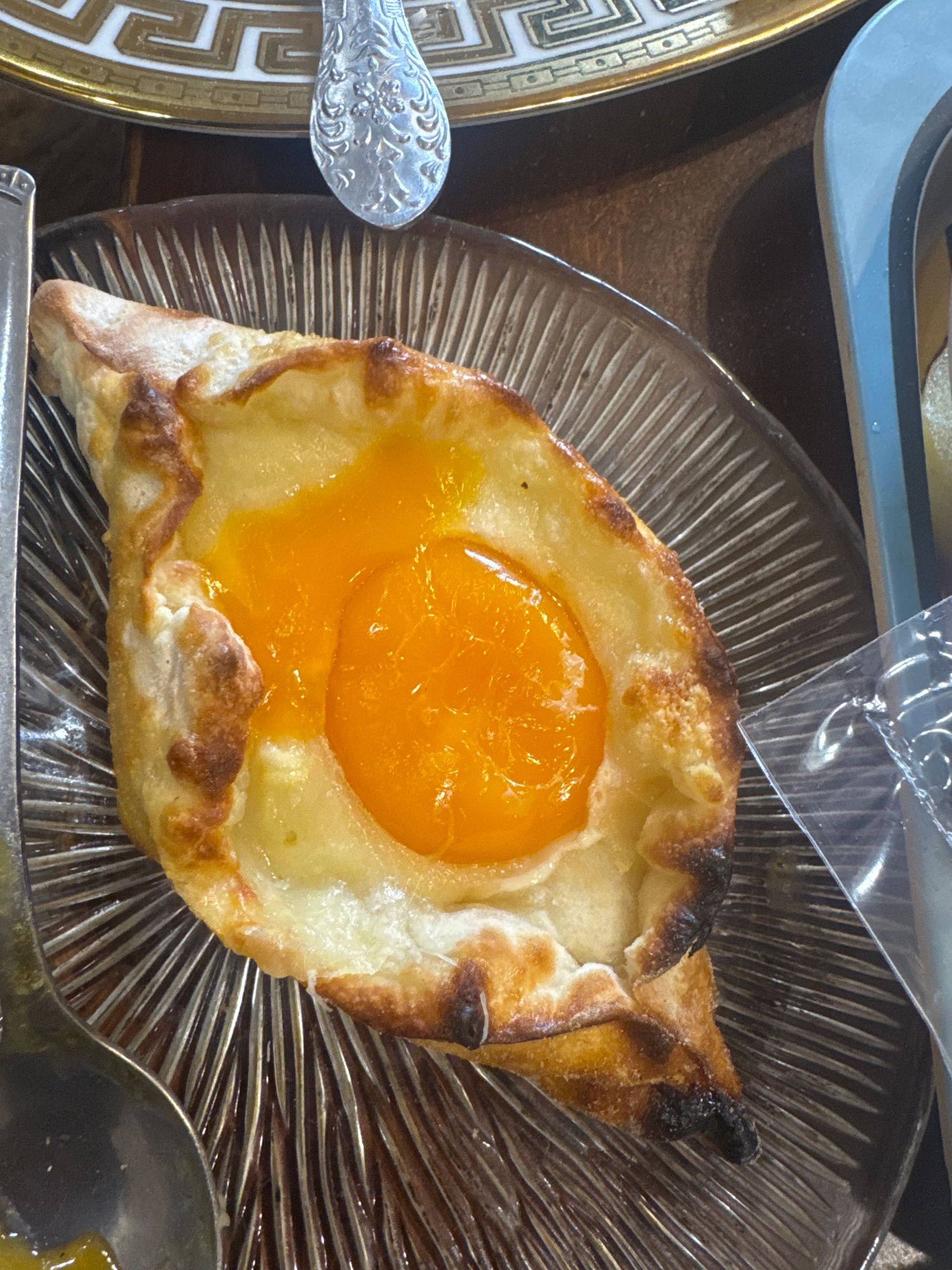 A close-up shot depicts an adjarian khachapuri, a traditional Georgian bread dish, on a clear glass plate with radiating lines. The khachapuri is boat-shaped with a golden-brown crust. The center is f…read more