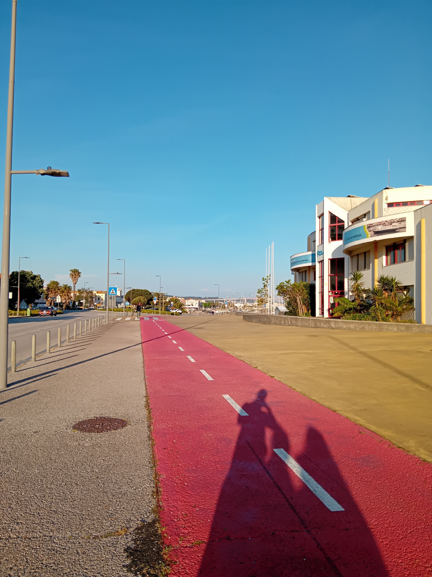 The image depicts a view of a street in Figueira da Foz, Portugal. The perspective is from near the ground, looking down the street. On the right, there is a red bike path with white dashed lines and…read more