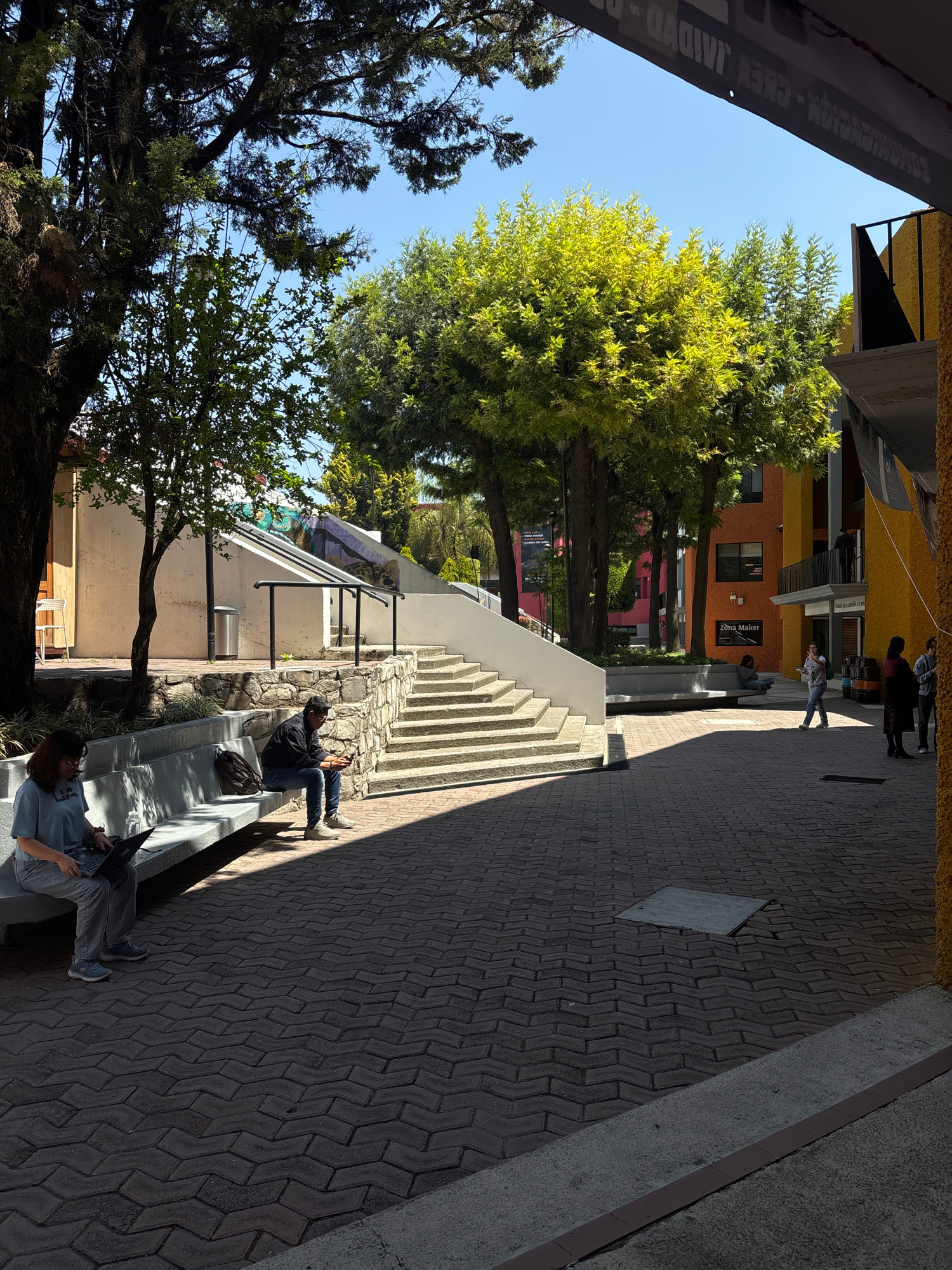 The image depicts a pedestrian walkway in San Andrés Cholula, Mexico. Two individuals are seated on a low concrete bench, one with a laptop. A person is seated on a raised ledge alongside a flight of…read more