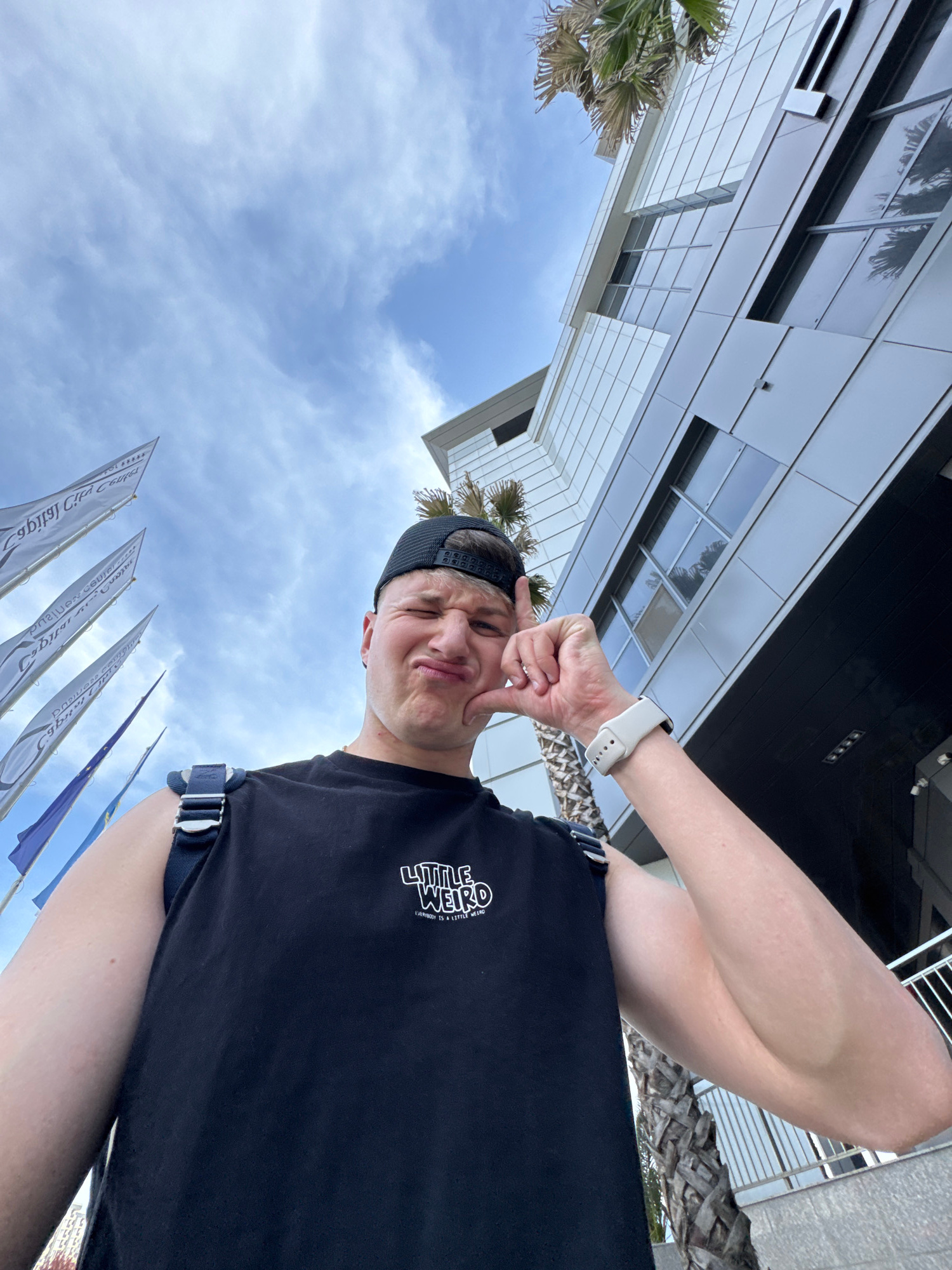 The image, taken from a low-angle perspective and rotated 90 degrees counter-clockwise from its upright orientation, features a young man striking a playful pose against a backdrop of modern buildings…read more