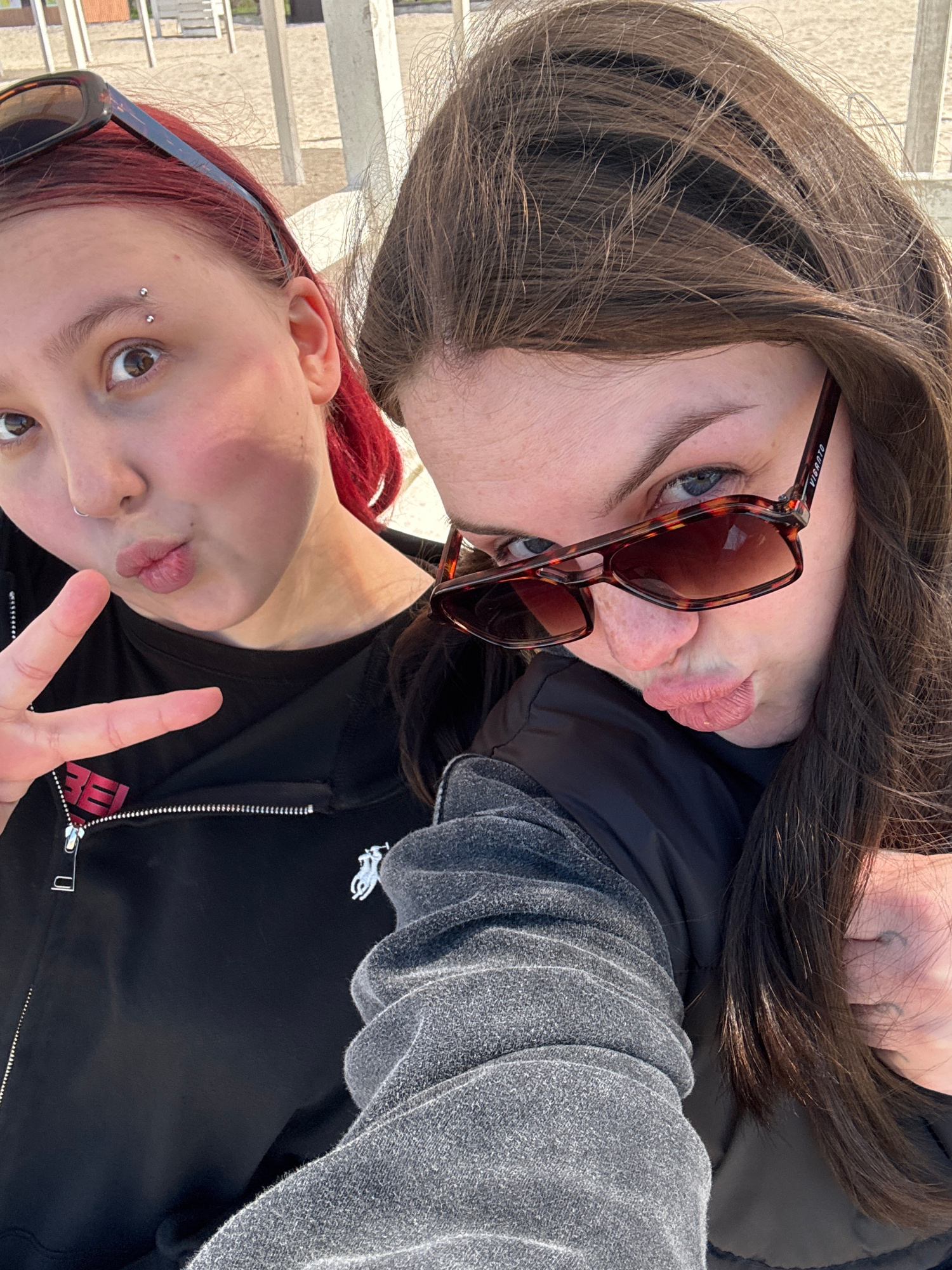 Two individuals pose closely for a selfie. The individual at the top has brown hair and is wearing sunglasses. They are making a face by sticking out their tongue. The second person has red hair and i…read more