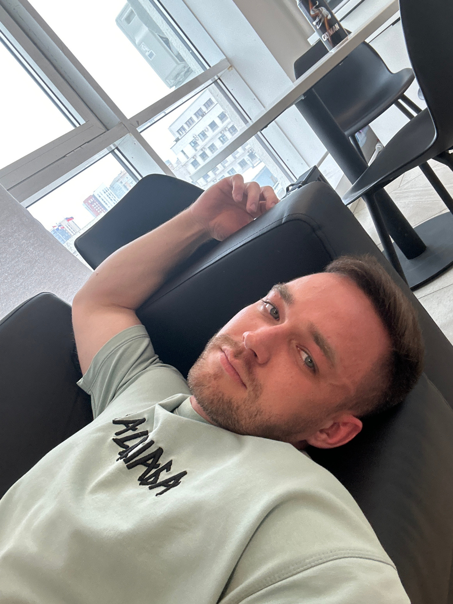 A man with short brown hair and a light beard is reclining in a black leather chair. He is wearing a light green shirt with dark lettering on the right side of the frame. To the left, behind the man a…read more