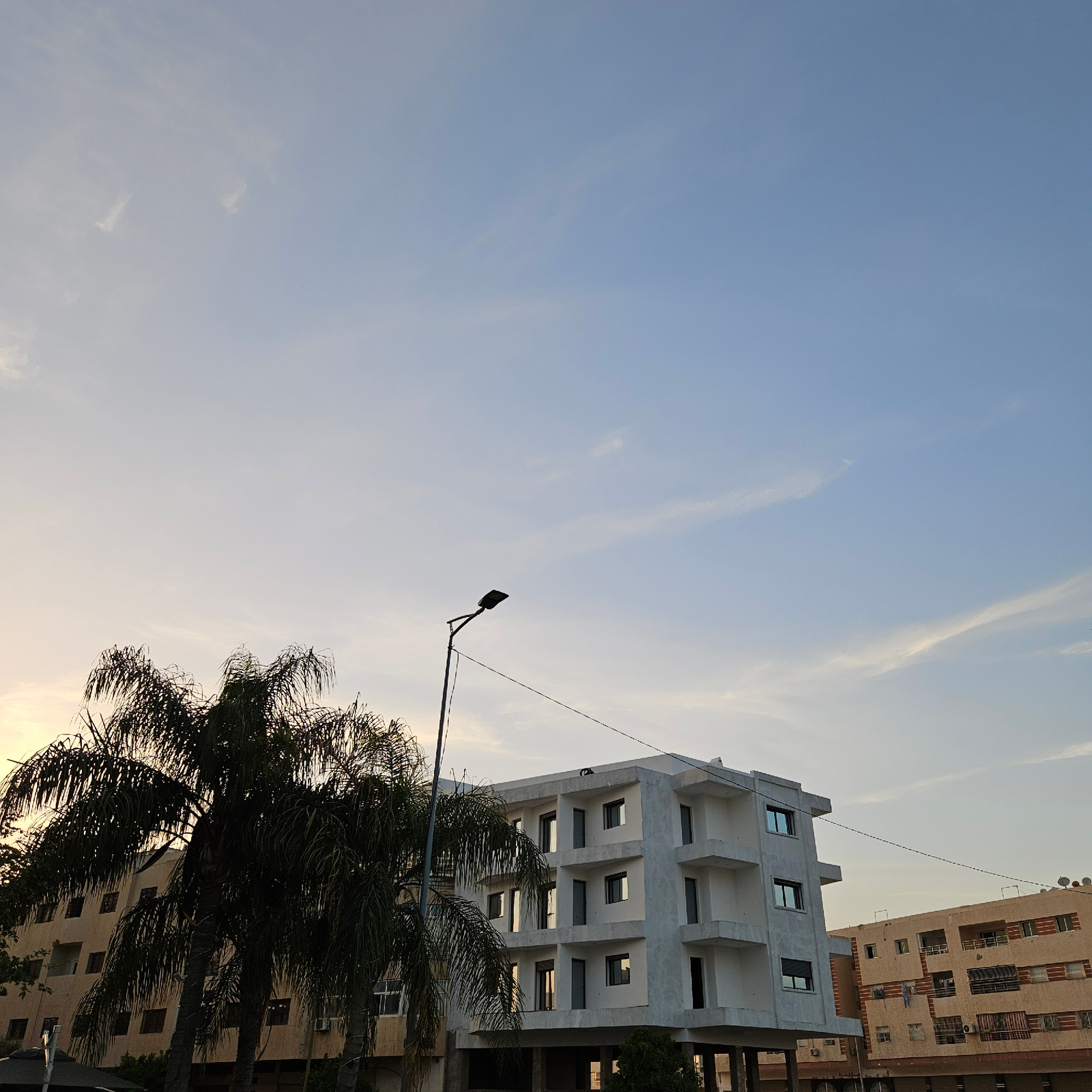 The image shows a view of a city scene, likely in Fez, Morocco, tilted to the side. The sky is a pale blue with wispy clouds. A palm tree stands in the lower right corner, partially obscuring a beige…read more