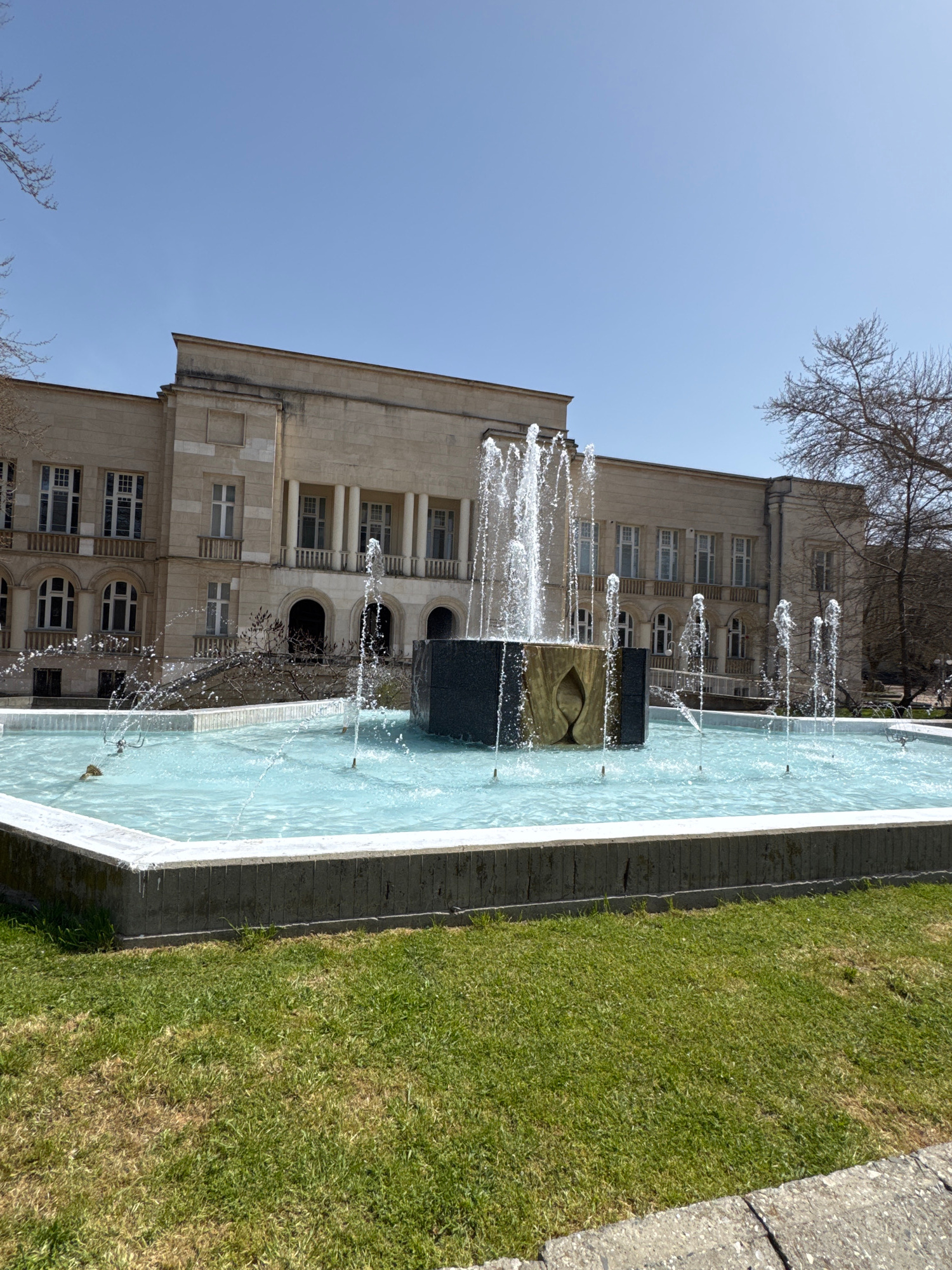 The image captures a fountain in Dobrich, Bulgaria. The fountain is rectangular and filled with clear water. It features a central structure consisting of black and gold cubes, with water jets sprayin…read more