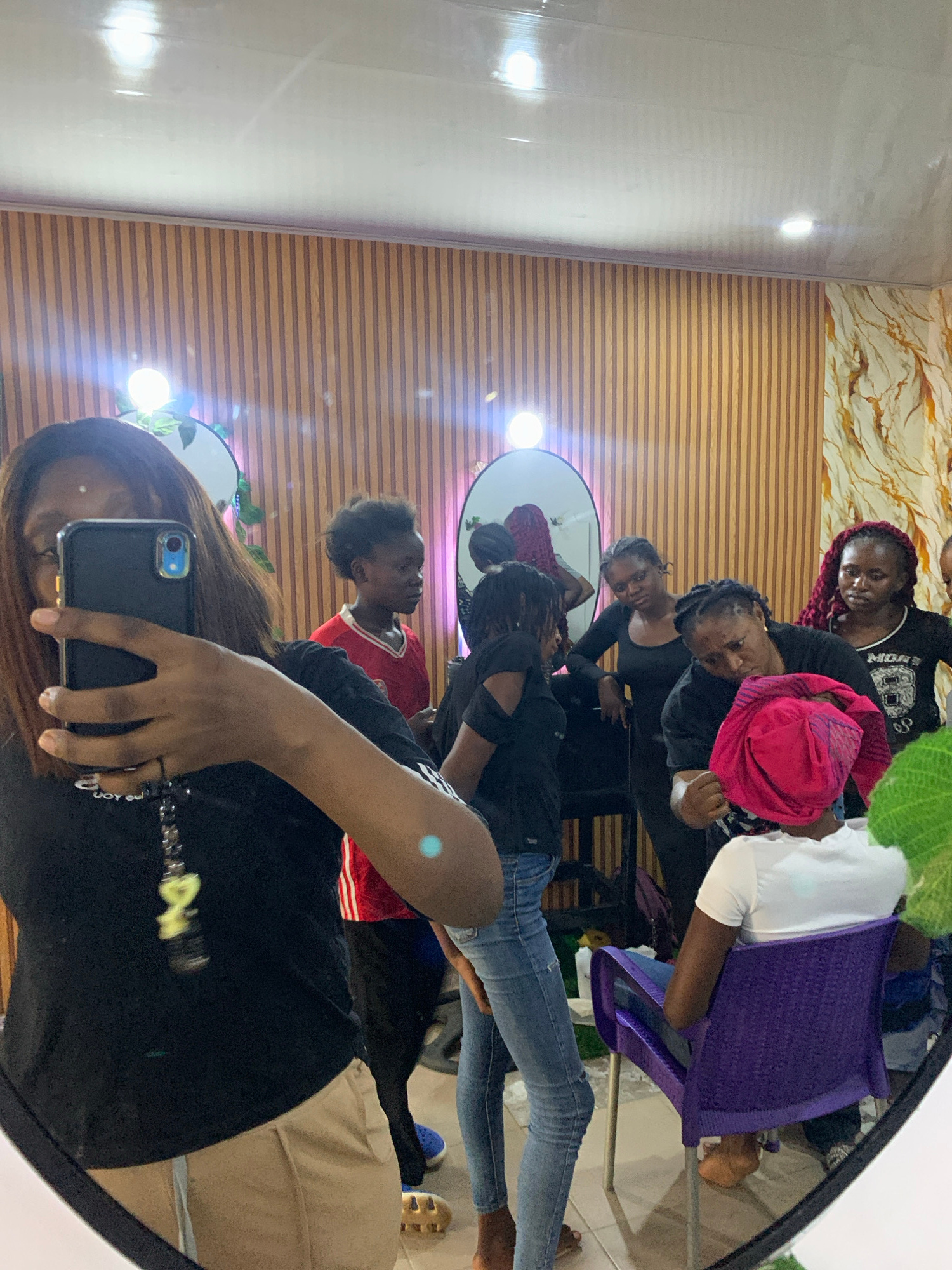 The image shows a selfie taken in a room, likely a salon or waiting area, as reflected in a circular mirror. The location is presumably in Jos, Nigeria. The selfie-taker is an individual holding a mob…read more