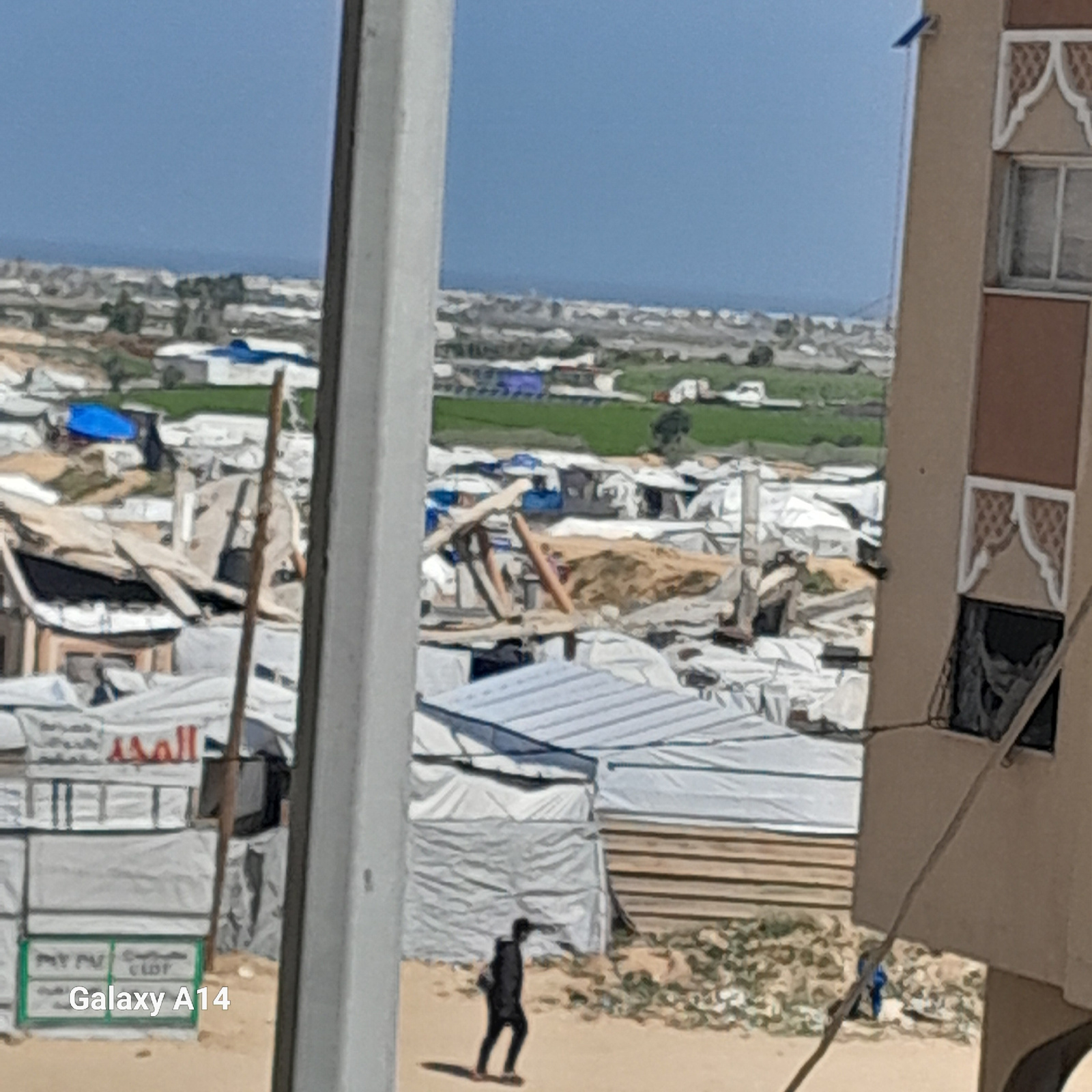 The image shows an elevated view of what appears to be a refugee camp, possibly in Khan Yunis, Palestinian Territory. The camp consists of numerous white tarpaulin tents and makeshift shelters. Some s…read more