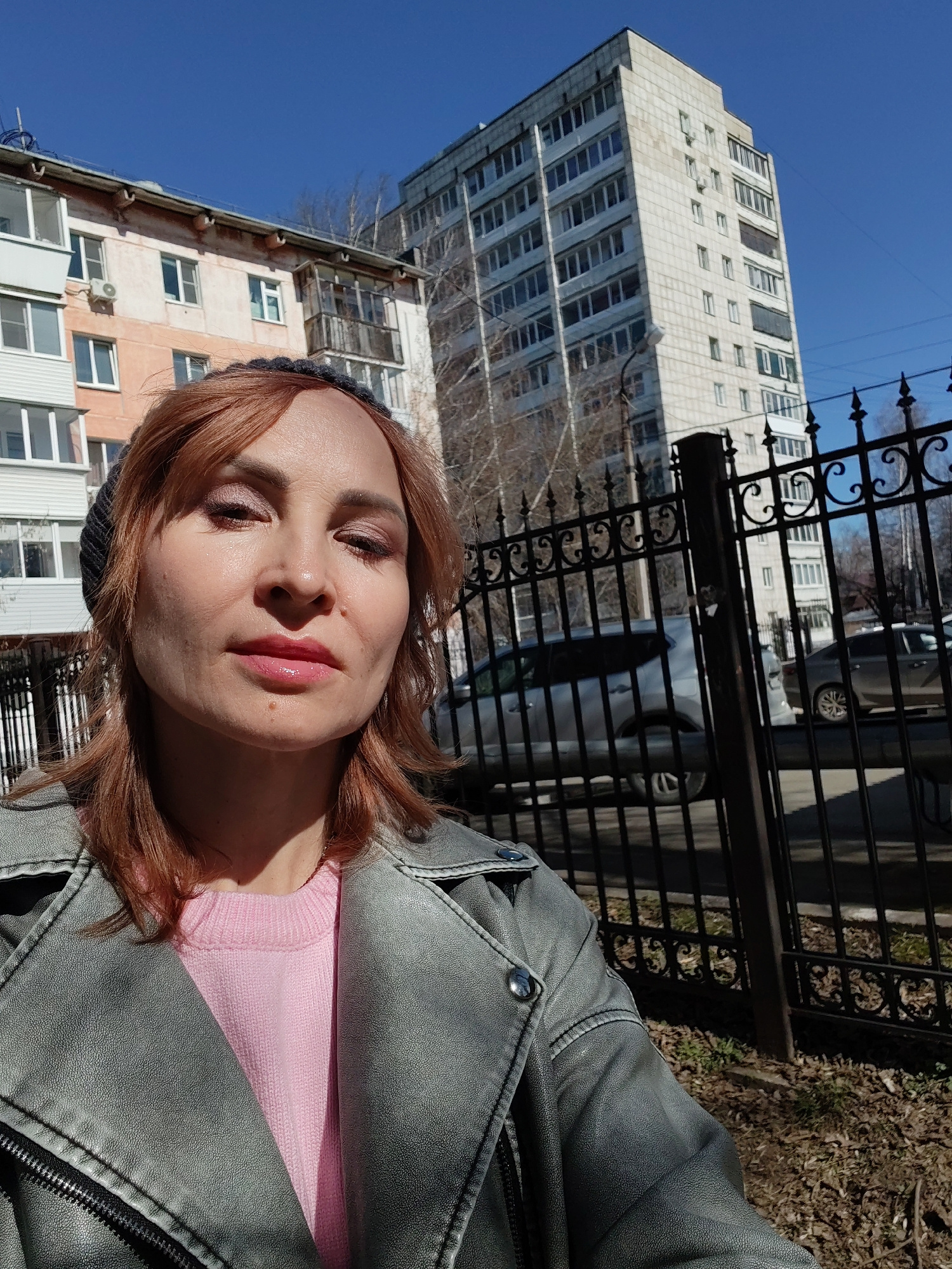 A woman is standing outside in Chaikovsky, Russia, on a sunny day. She is wearing a gray leather jacket over a pink sweater and a dark-colored knit hat. She has reddish-blonde hair and appears to be w…read more