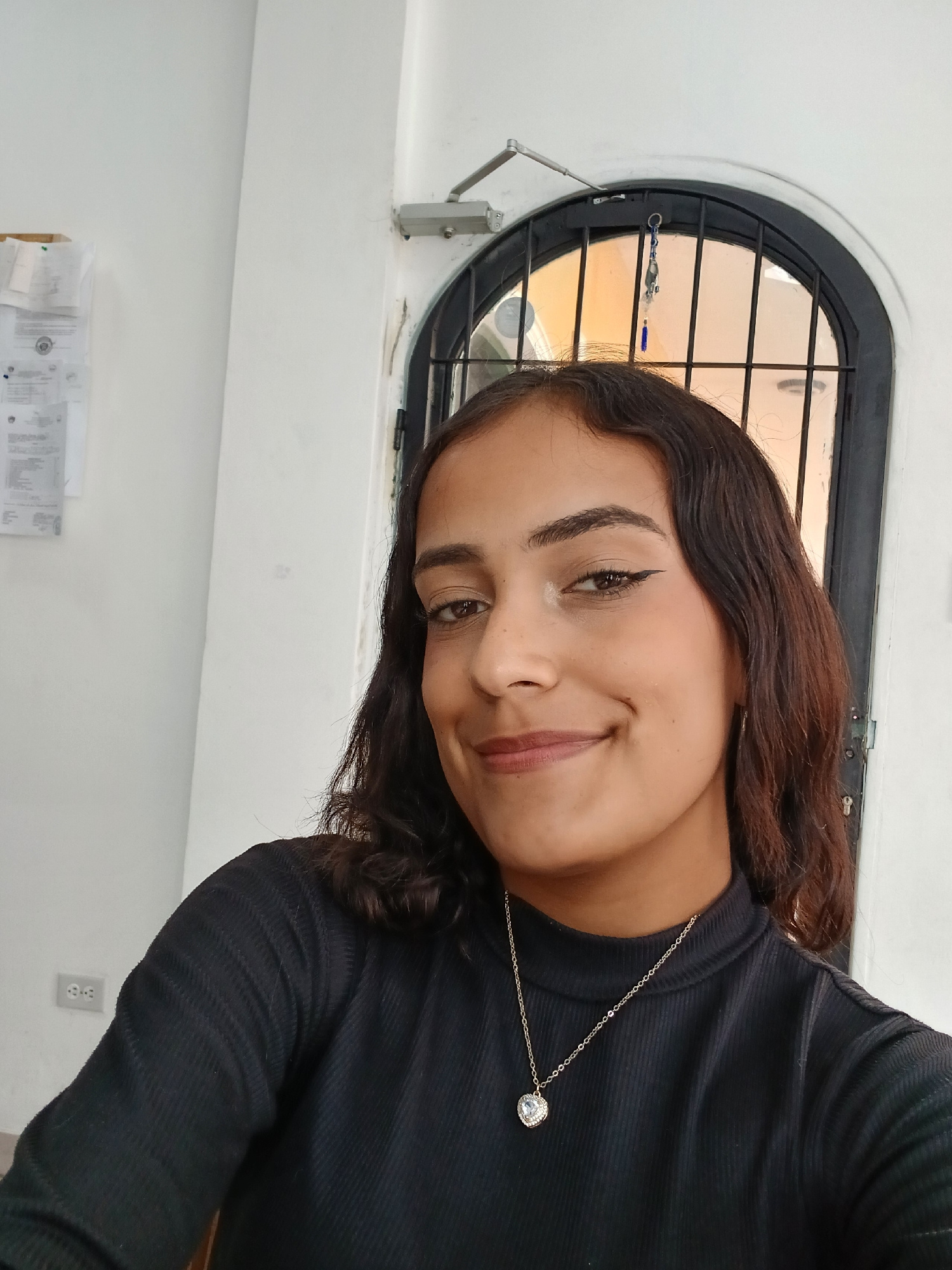 A young woman is posing for a selfie indoors. She has medium-length brown hair and is wearing a black, long-sleeved shirt and a silver necklace. Behind her is a circular window with a black metal grid…read more