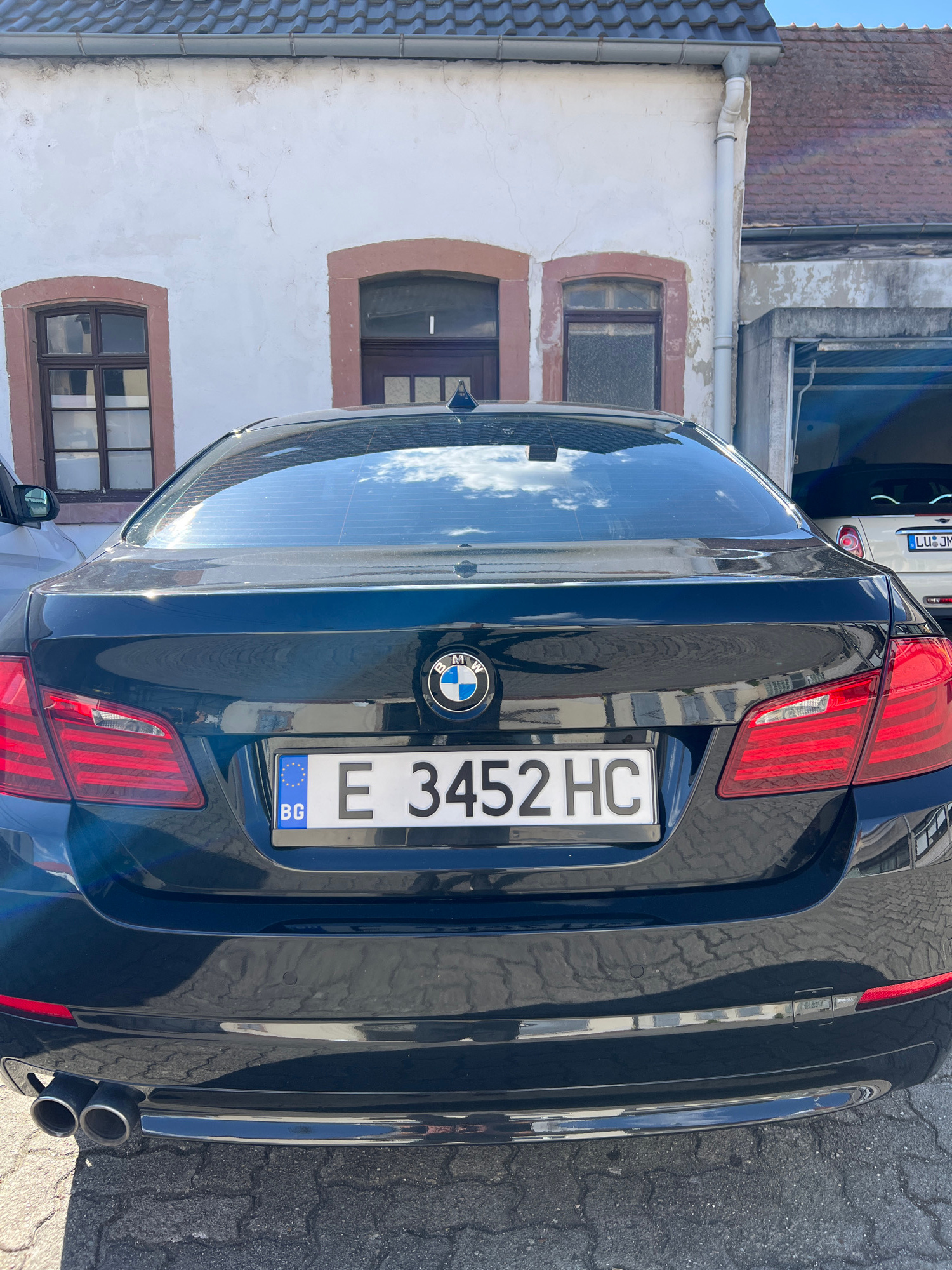 The image shows the rear of a dark-colored BMW, specifically its license plate with the number "E 3452 HC". The license plate also has the "BG" country code, indicating that the car is registered in B…read more