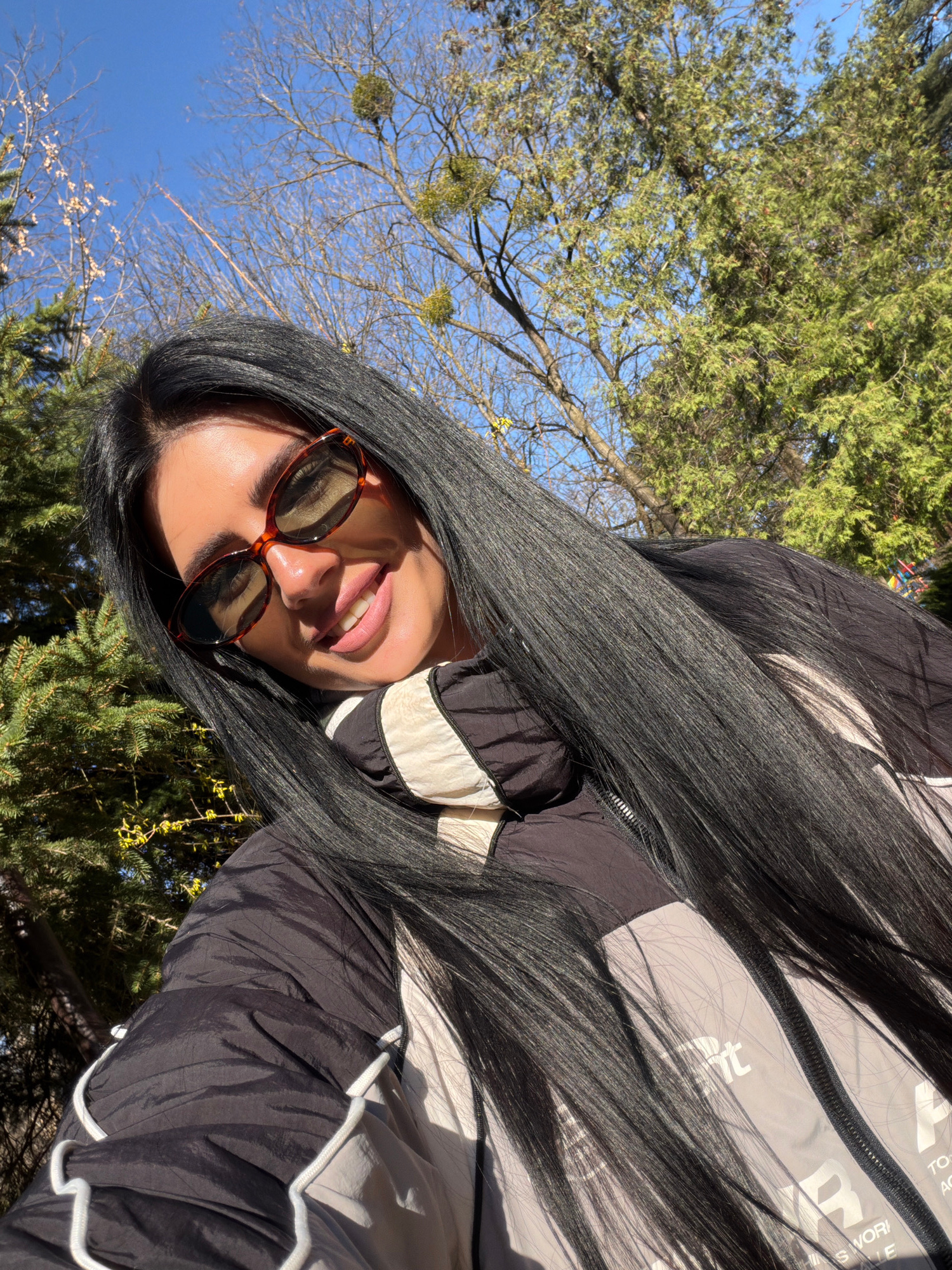 A woman with long, dark hair and wearing sunglasses is outdoors. She is wearing a black and grey jacket. The background includes green trees, branches and a clear blue sky. Due to the lack of contextu…read more
