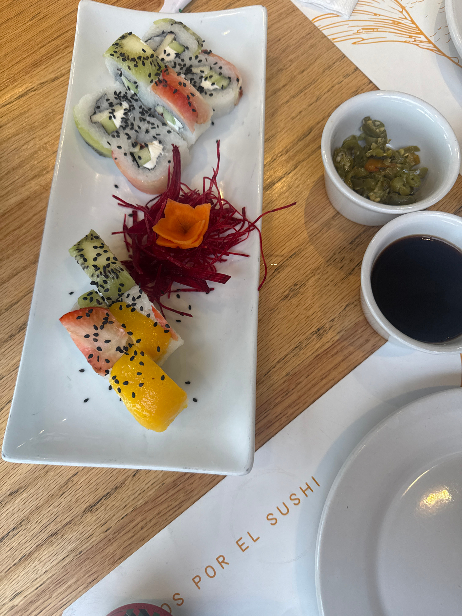 On a wooden surface, presumably a table, sits a white rectangular plate of sushi rolls. The rolls are decorated with black sesame seeds and contain fillings such as kiwi, cucumber, strawberry, and man…read more