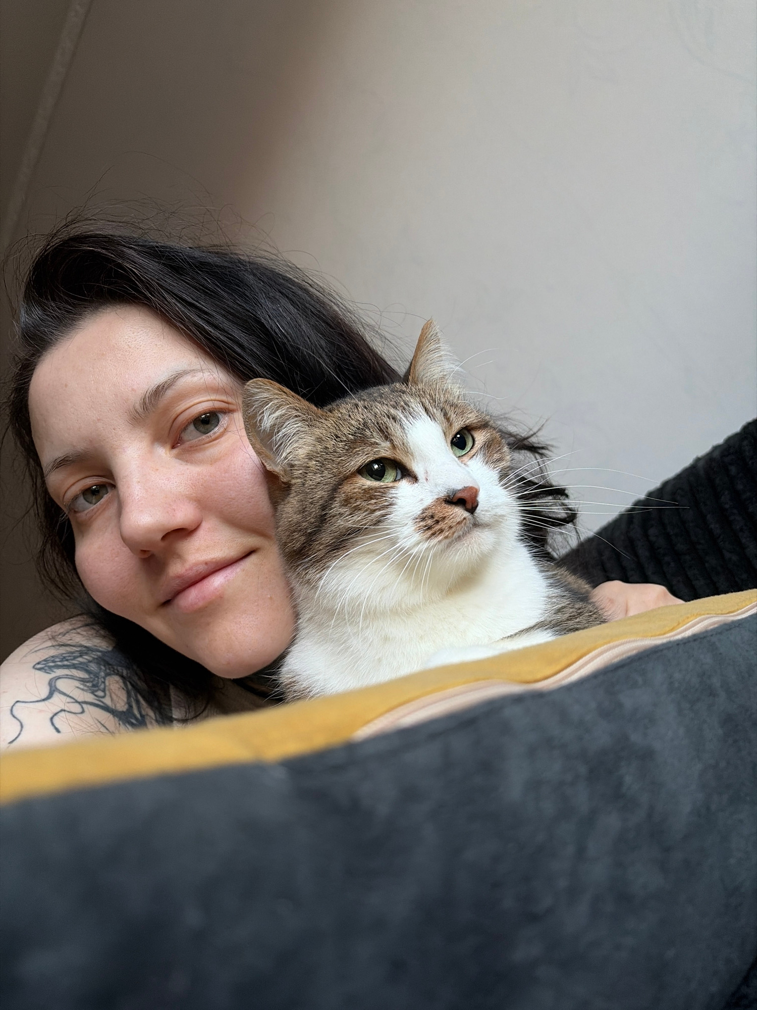 A woman with dark hair and a light complexion is holding a brown and white cat. The cat is looking upwards. The woman is also looking upwards, but slightly to the left of the cat. The woman has a tatt…read more