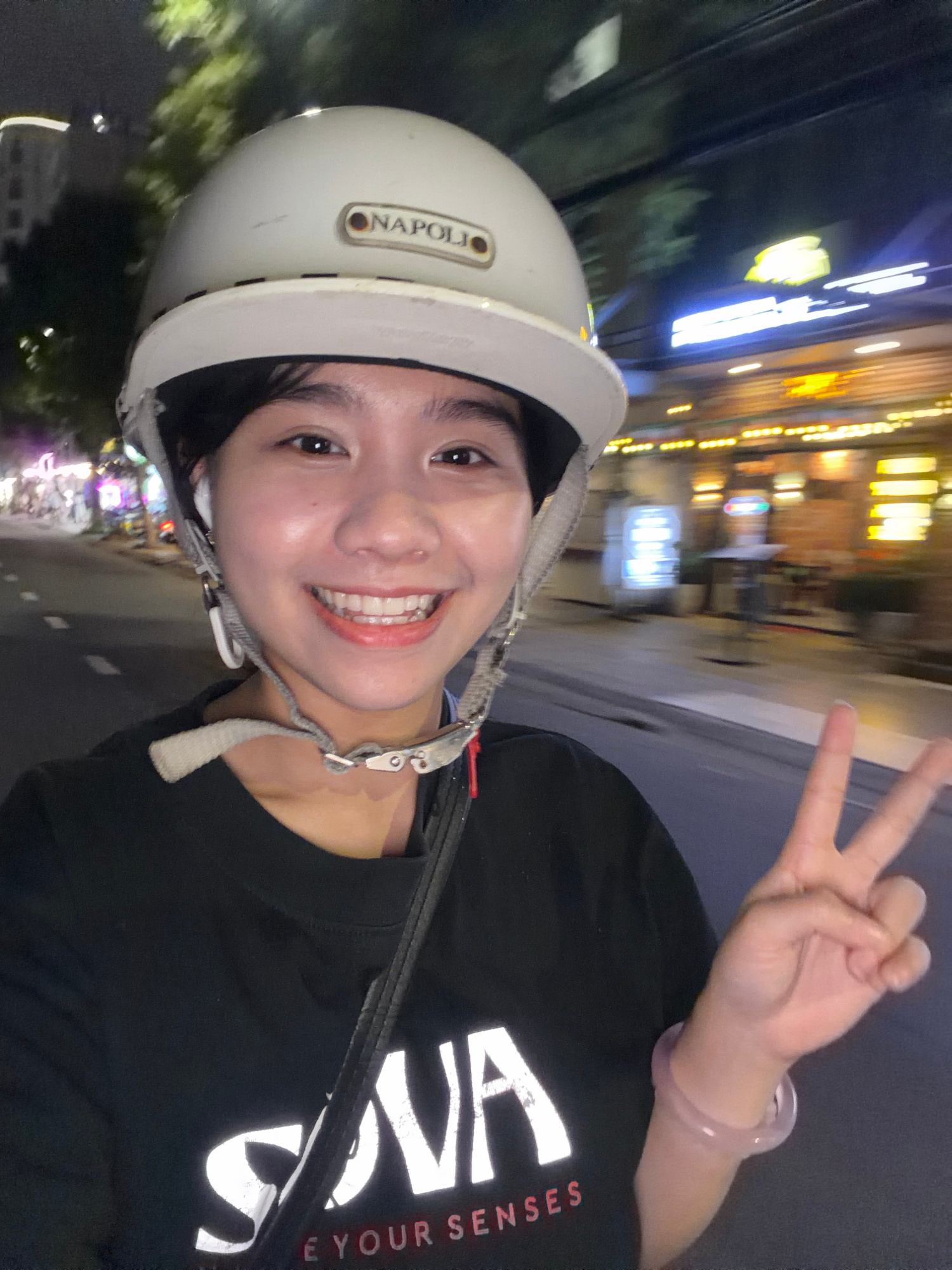 A person wearing a white "NAPOLI" helmet and a black T-shirt is making a peace sign with their right hand. The person appears to be riding a motorcycle or scooter at night. The background suggests an…read more