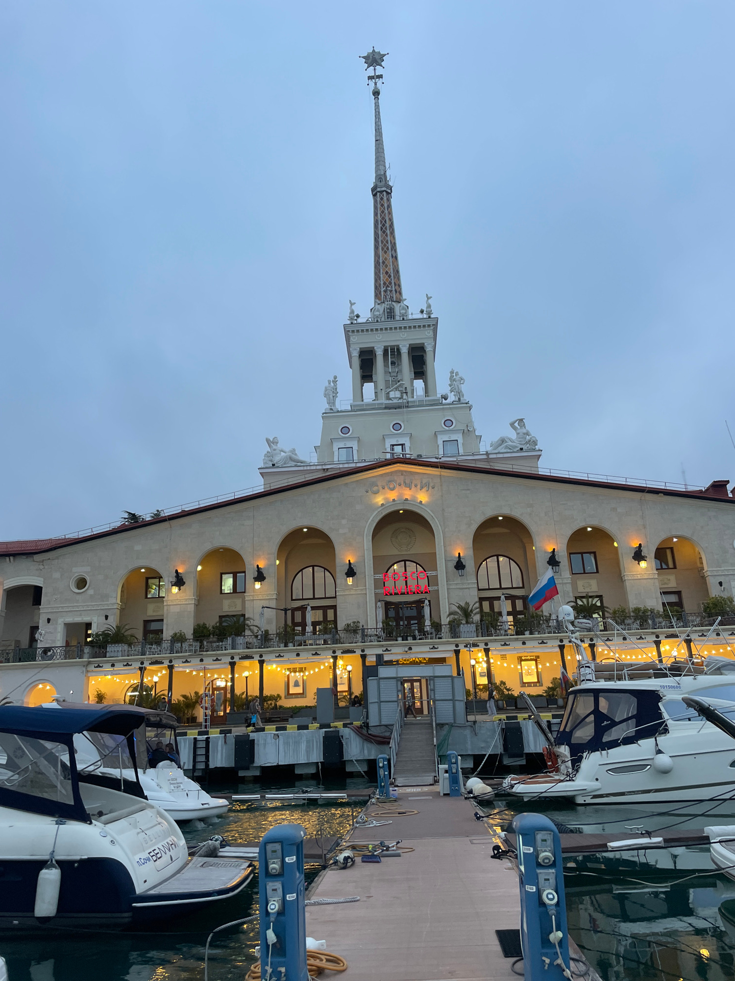 The image depicts the Sochi Marine Terminal in Sochi, Russia. It is an evening shot capturing the terminal building with its distinctive spire and classical architecture, adjacent to a marina. The bui…read more
