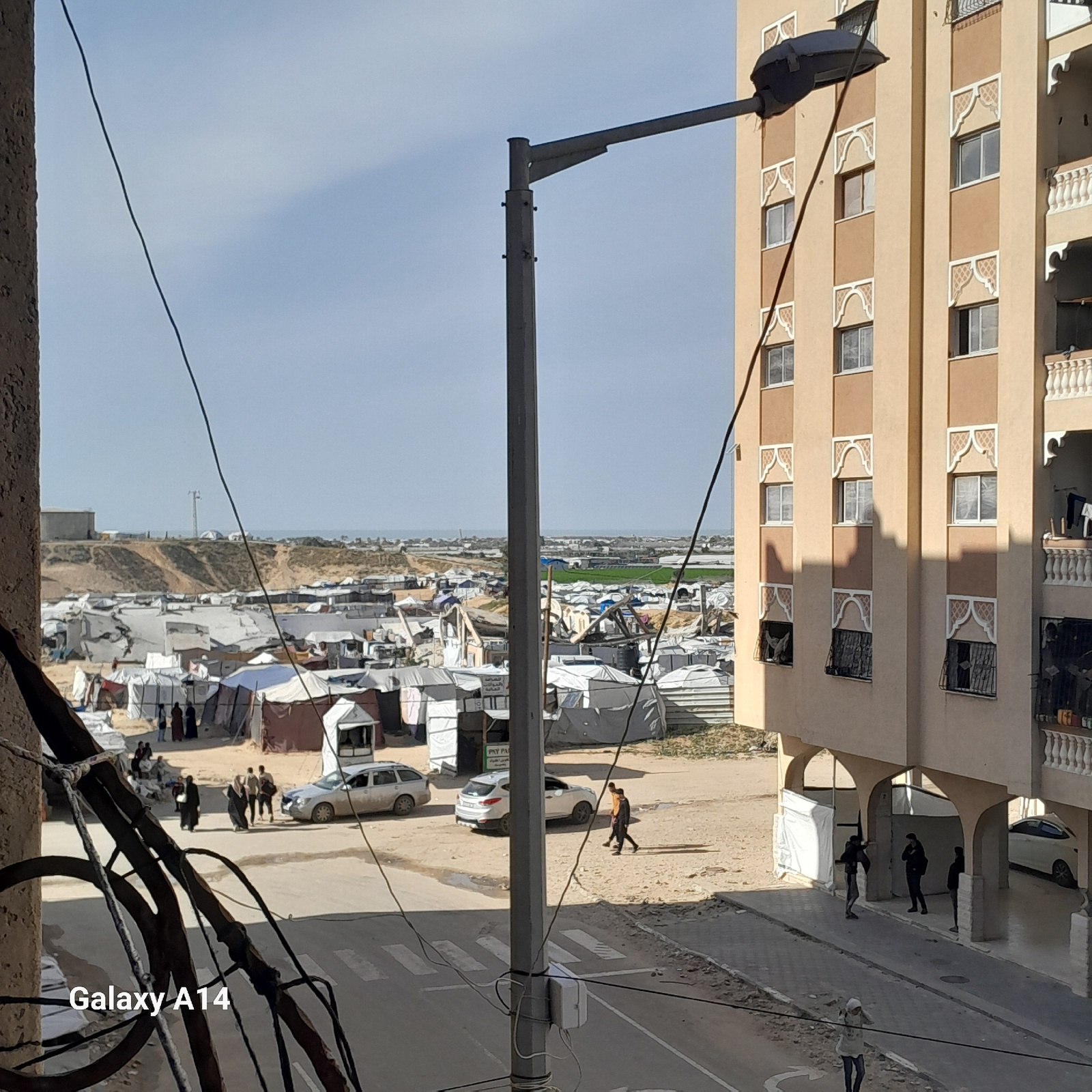 The image, taken in Khan Yunis, Palestinian Territory, shows an elevated view of a densely populated area. A tan-colored building with multiple floors and windows is visible at the top of the image. B…read more