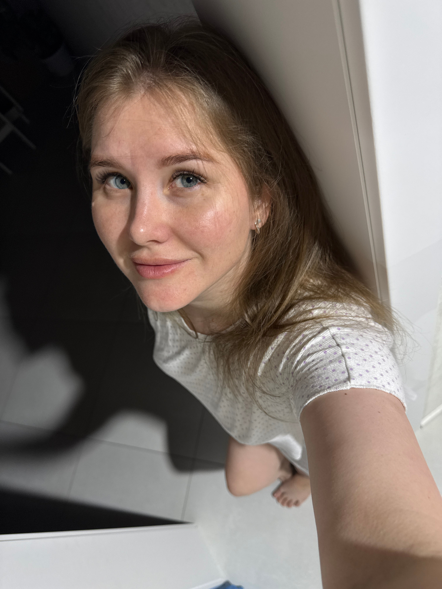 A blonde woman is kneeling on a gray tiled floor in what appears to be a bathroom. She is wearing a white shirt with light purple polka dots. Her right shoulder and arm are visible. She has blue eyes,…read more