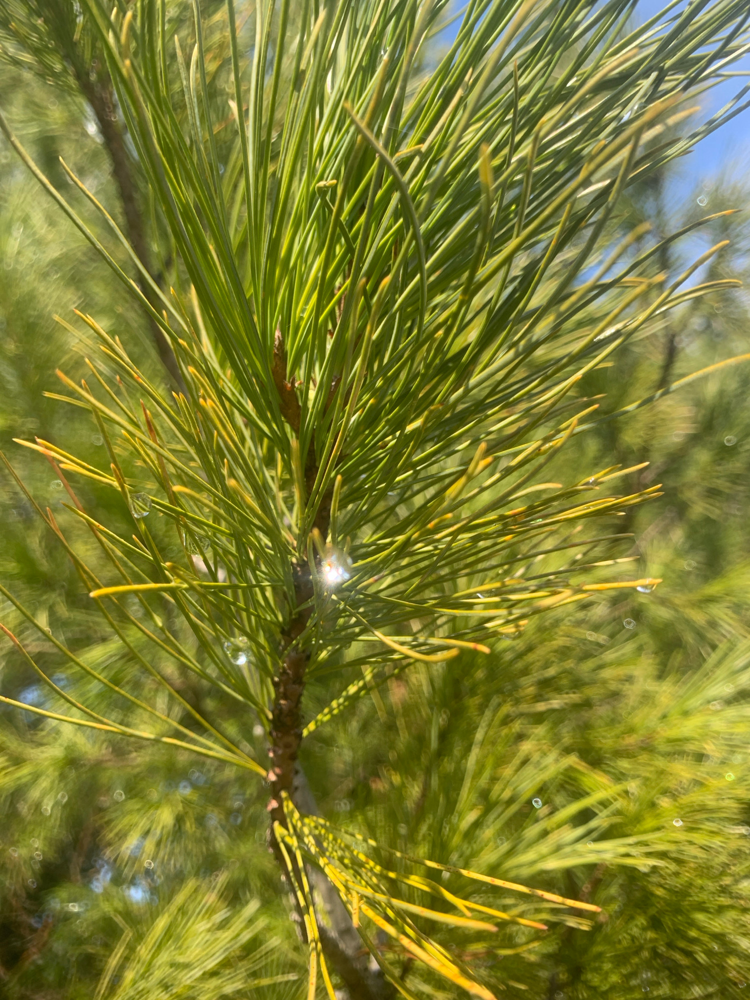 A close-up shot shows pine needles of a tree, potentially located in Кадряково, Russia. The needles are predominantly green with some yellowing tips, suggesting maturity or seasonal change. A twig or…read more