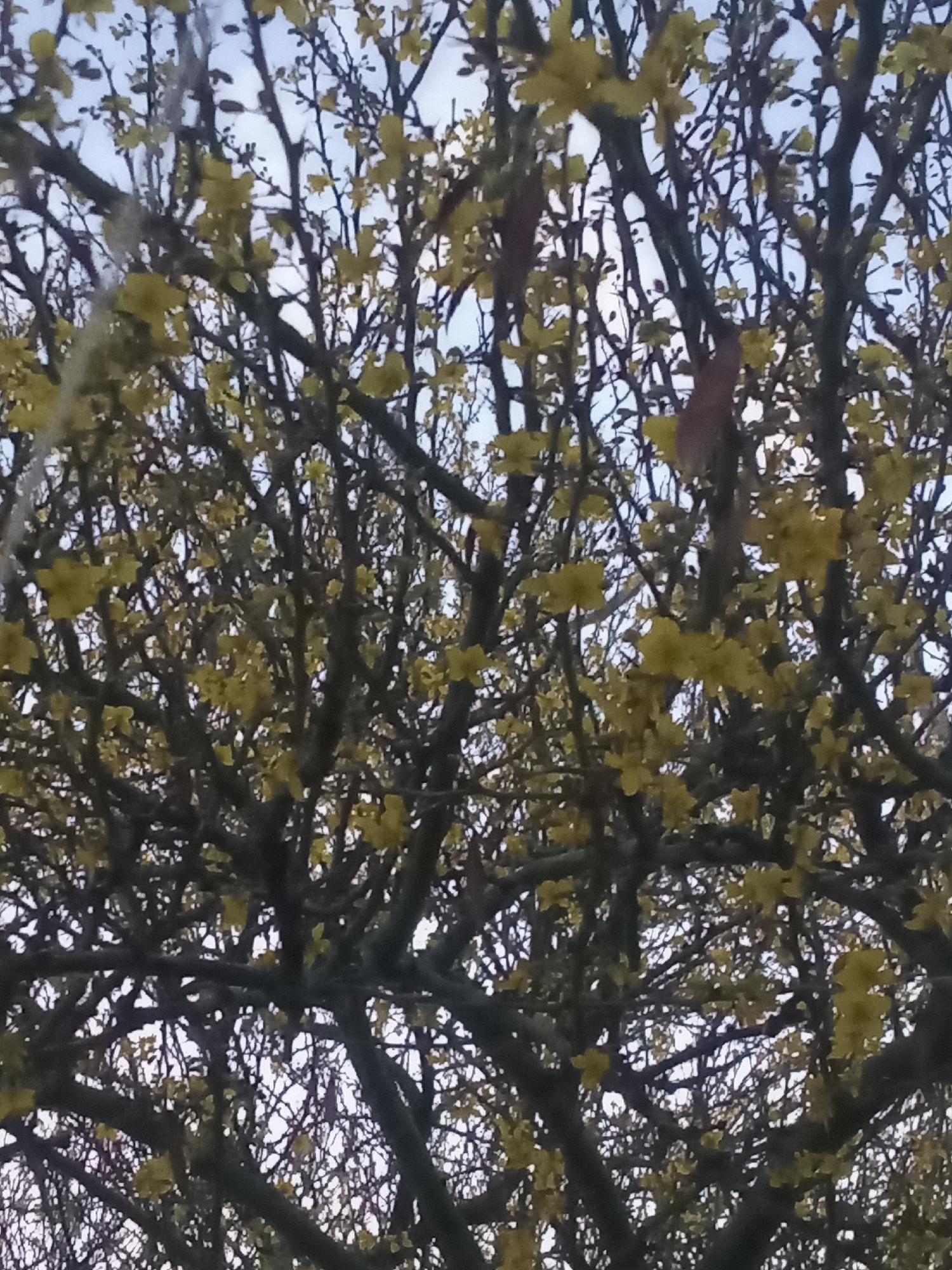 The image shows a dense tree canopy against a pale sky. The tree has many bare, dark branches interspersed with small, sparse yellow leaves or blossoms. There are a couple of brown, shriveled leaves sā¦read more