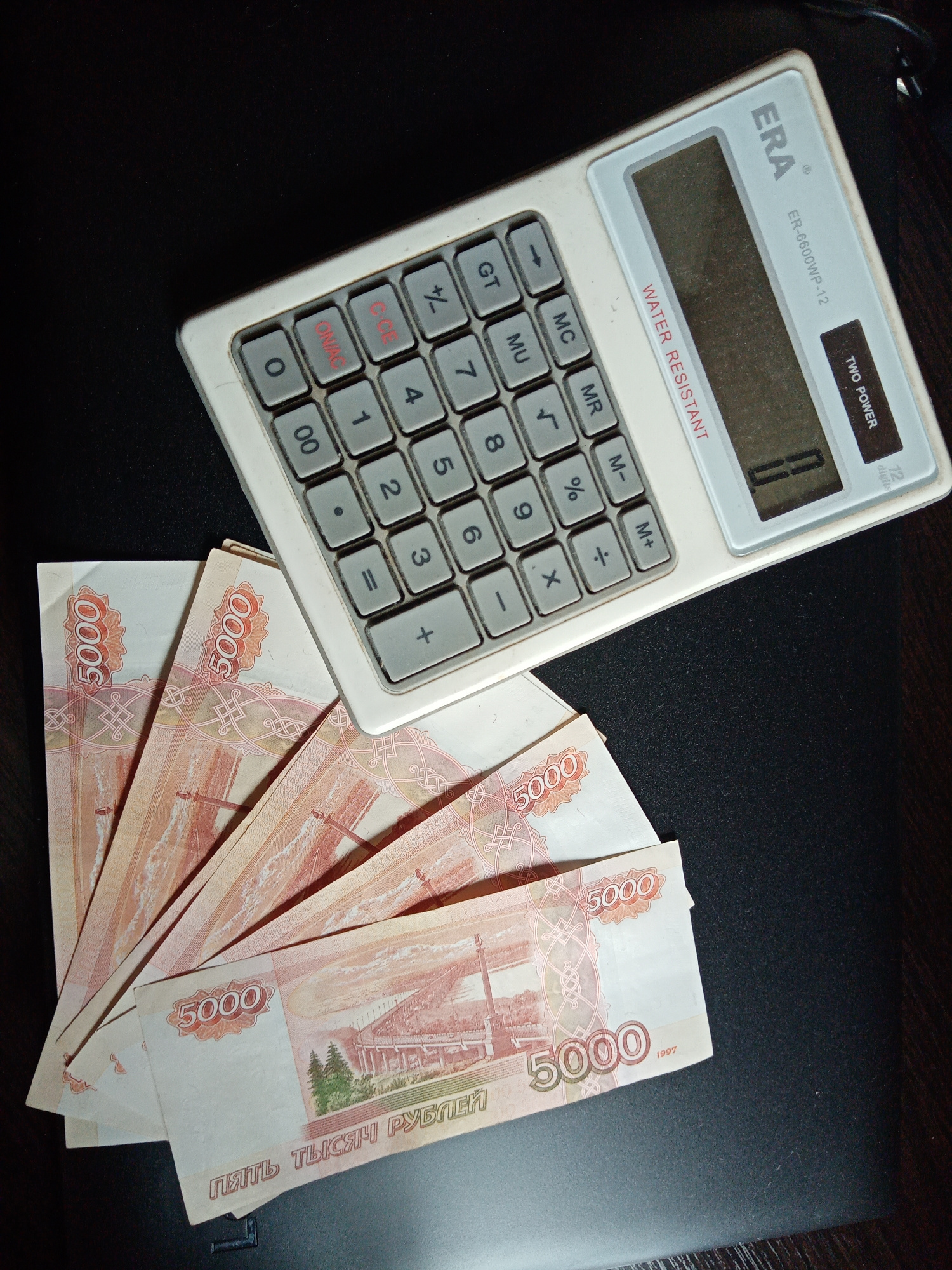 The image displays a flat lay composition featuring an electronic calculator and several Russian banknotes arranged on a dark, flat surface, likely a desk. The calculator, a white and grey ERA ER-6600…read more