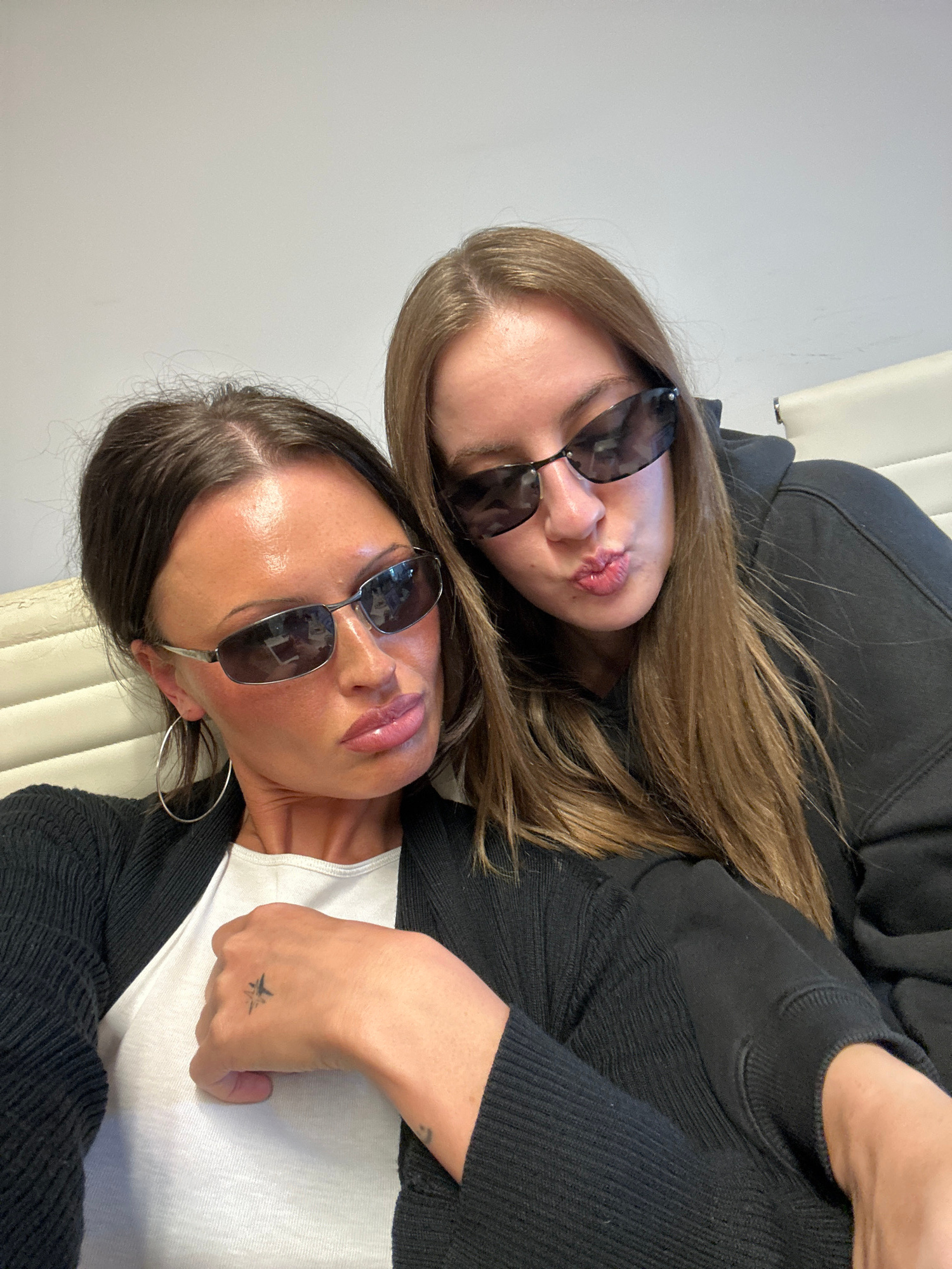 An indoor, close-up photograph features two young women, oriented ninety degrees clockwise. The women appear to be posing casually, with one embracing the other. The woman positioned towards the top o…read more