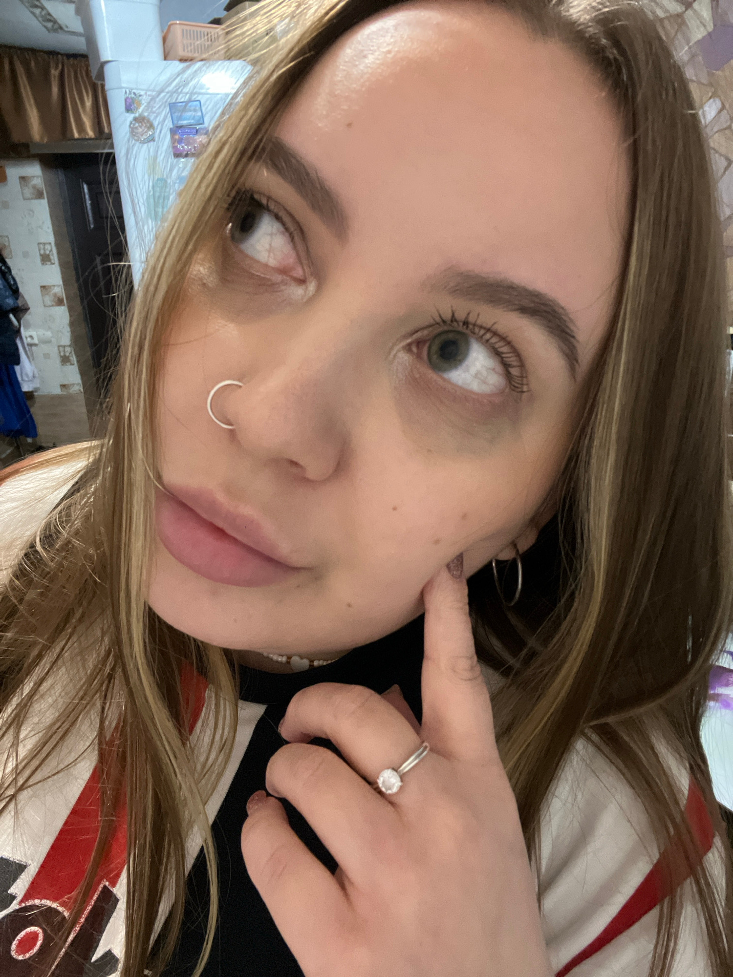 A close-up selfie of a young woman with light brown hair and green eyes. She is wearing a nose ring in her left nostril and an earring in her left ear. A ring with a prominent stone is on her left rin…read more