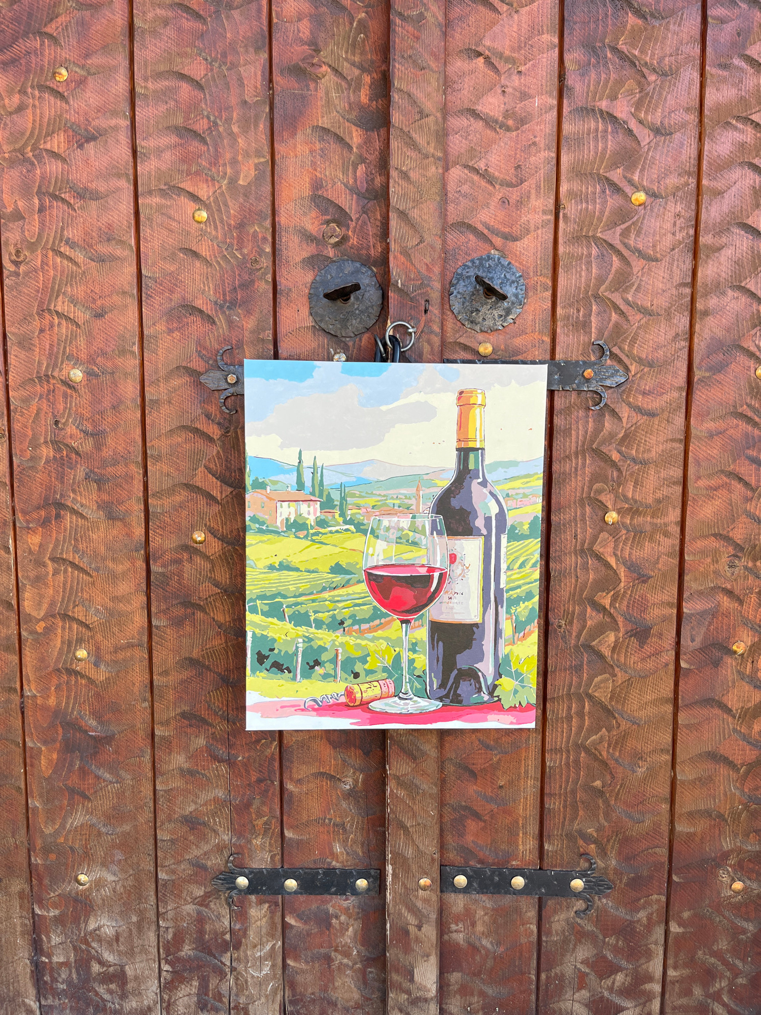 A close-up shot showcases a section of a heavily textured wooden door, adorned with ornate metal hinges and keyhole covers. A painting of a wine bottle and glass is mounted on the door. The environmen…read more