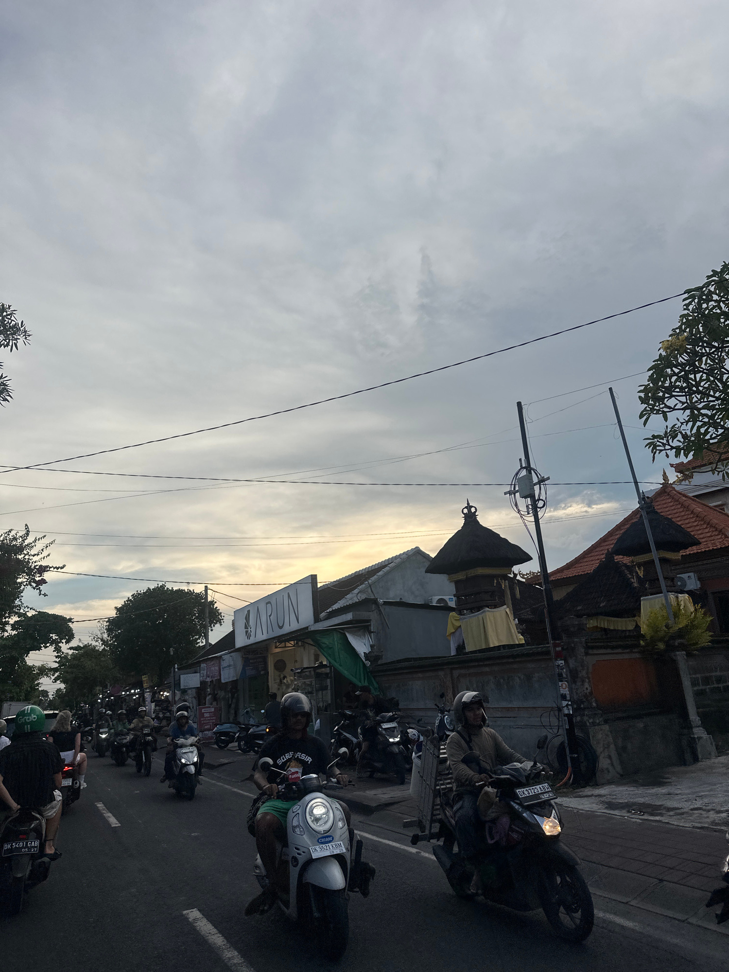 The image depicts a street scene in North Kuta, Indonesia. The view is oriented at an angle, showing the sky and the side of a road congested with parked and moving motorbikes. A building with a Balin…read more