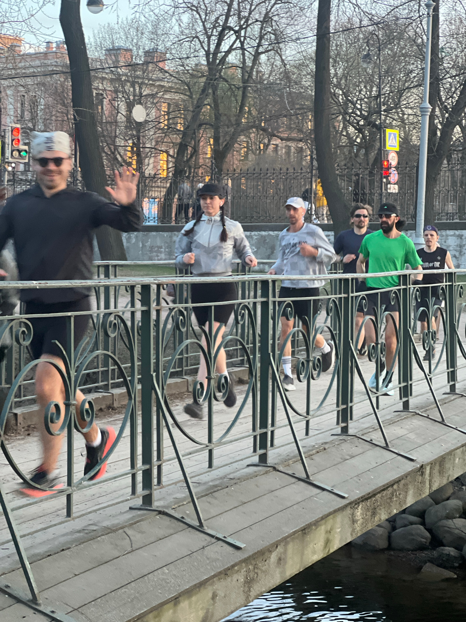The image shows a group of six people jogging along a paved pathway in Saint Petersburg, Russia, alongside a canal or river. A decorative green metal railing separates the pathway from the water, whic…read more