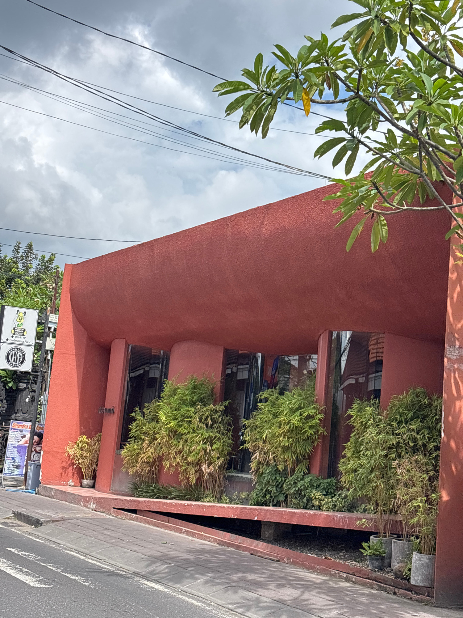 The image presents a daytime street scene in North Kuta, Indonesia, featuring a distinctively colored building under a cloudy sky. The main subject is a modern, two-story building rendered in a deep r…read more