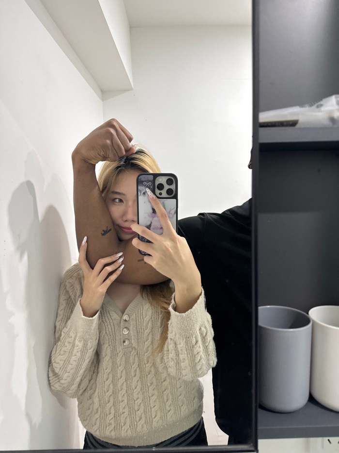This image is a mirror selfie taken indoors in Yuzhong District, China. The central subject is a woman, appearing to be East Asian with blonde hair, who is smiling and looking towards the camera of he…read more