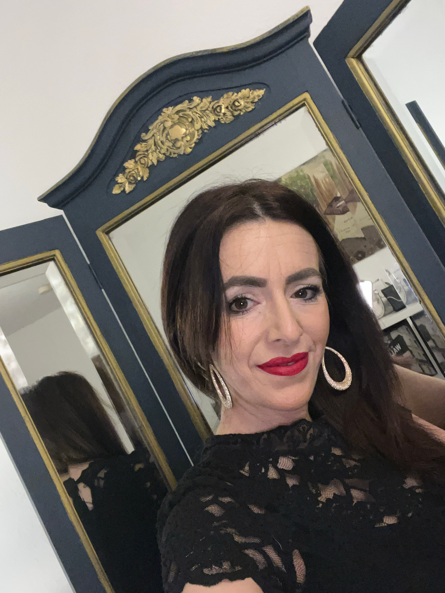 A woman is reflected in a multi-paneled mirror with ornate gold and blue detailing. She has dark hair, fair skin, and is wearing red lipstick and large hoop earrings. Her clothing appears to be black…read more