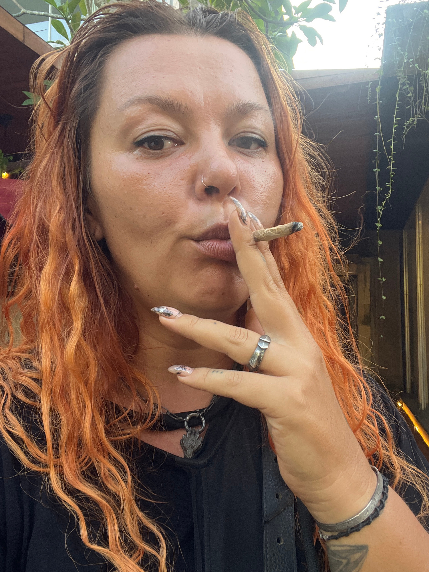 A woman with fair skin and shoulder-length curly orange hair is seen from a slightly low angle. She has a nose ring and wears a black top. She is holding a lit cigarette near her lips. The nails on he…read more
