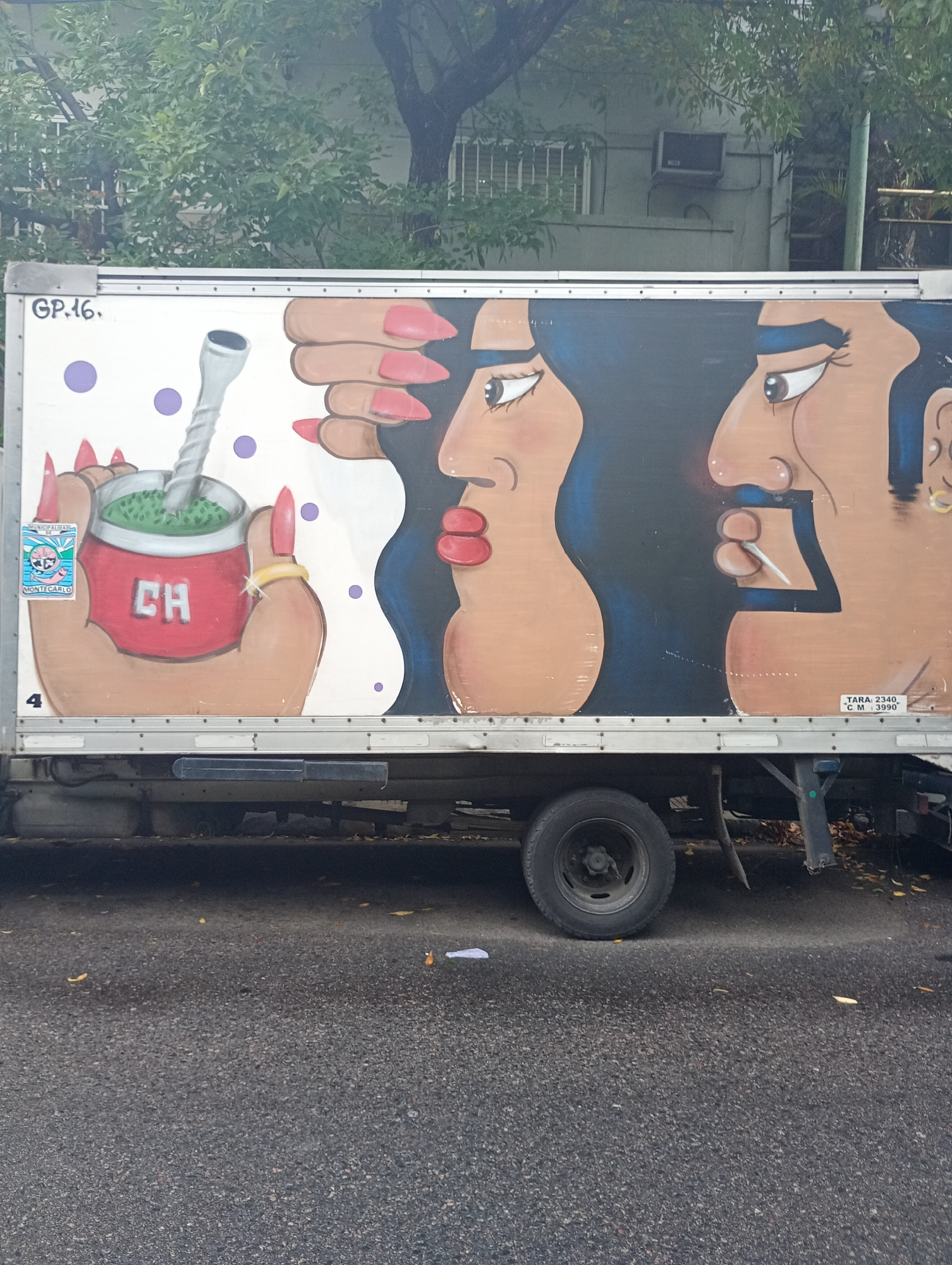 The image shows the side of a truck parked on a street in Buenos Aires, Argentina. The truck's cargo area features a mural depicting a woman holding a mate gourd in her hand with long, red nails. The…read more