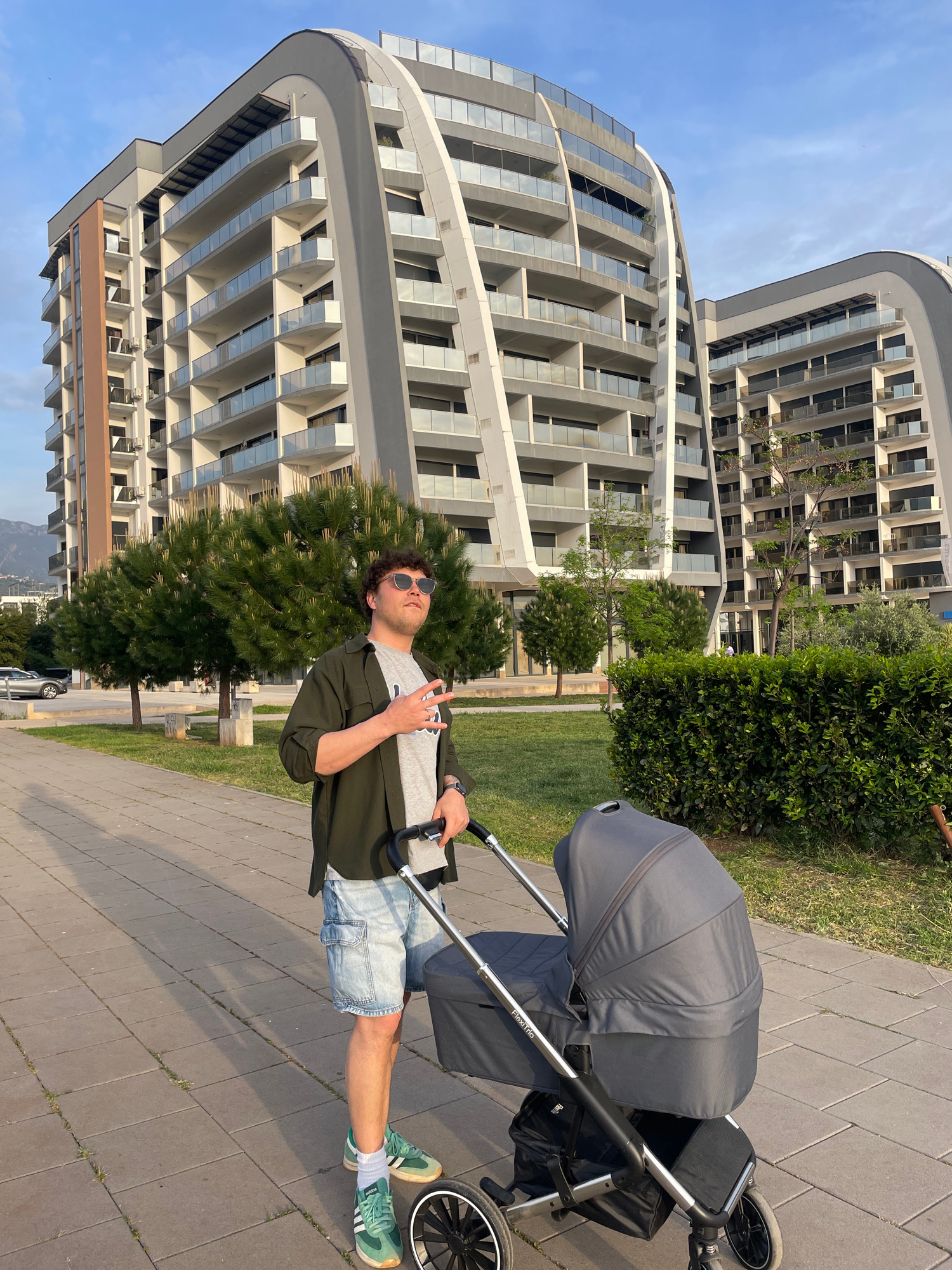 An outdoor, full-length image captures a man pushing a baby stroller on a paved walkway under a clear blue sky. The man is positioned on the right side of the frame, facing slightly away from the came…read more