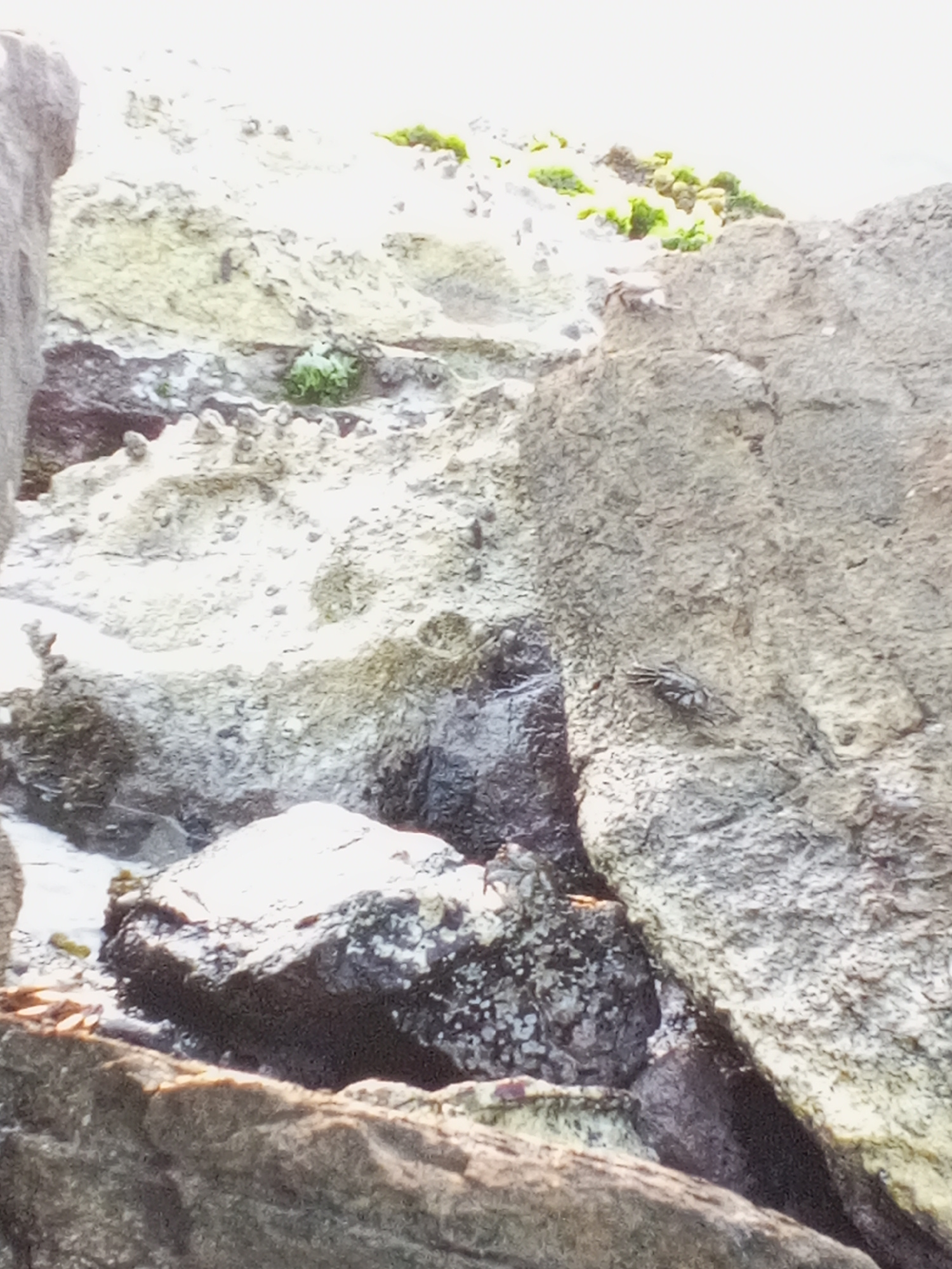 The image presents a rocky coastal scene, likely in Pedro González, Venezuela. Rocks of varying sizes dominate the frame, with one large, textured rock face on the right side. A smaller rock with whit…read more