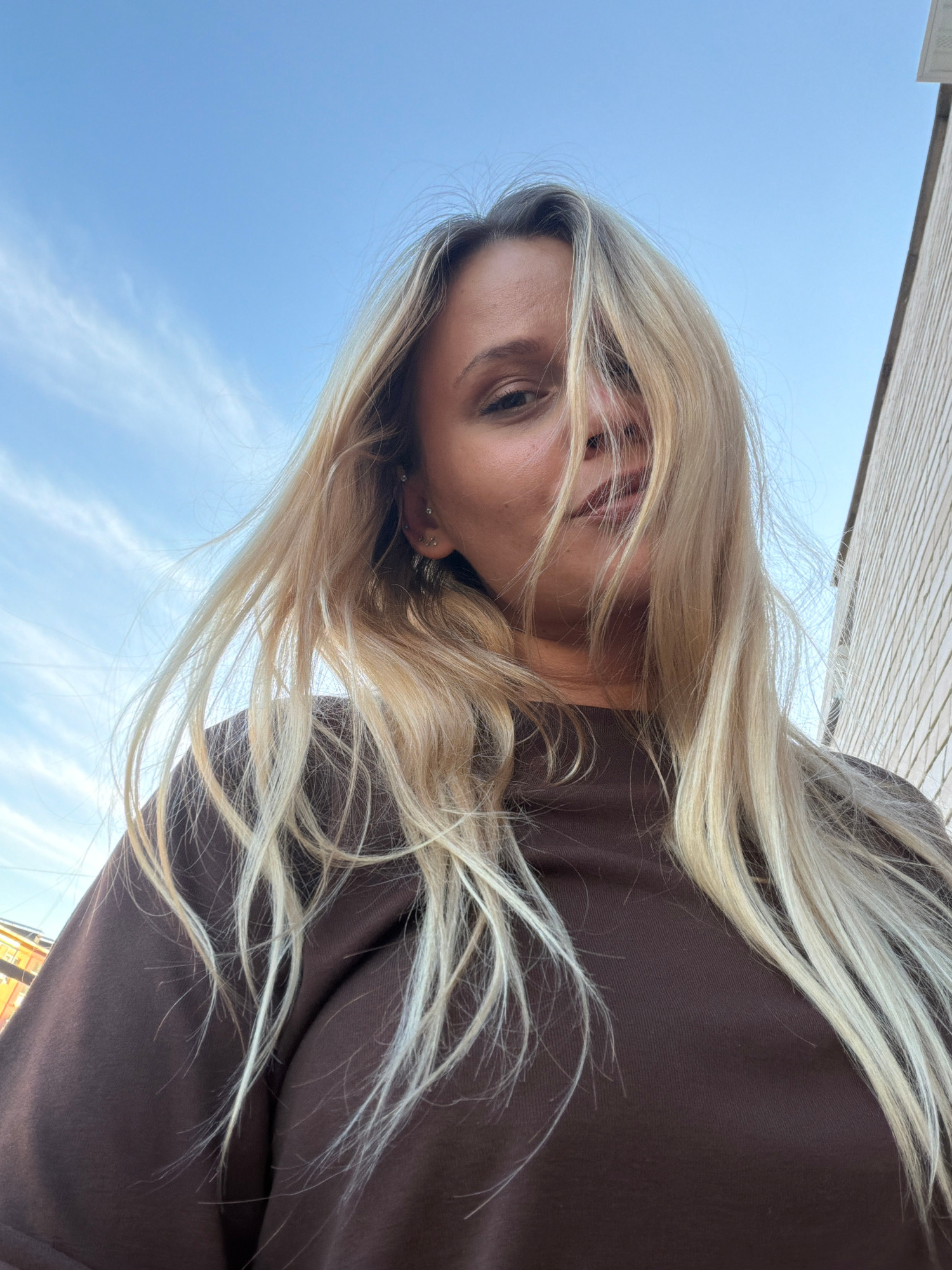 A woman with light blond hair and a brown shirt is looking down towards the camera. The sky is light blue with thin clouds in the background. A building is visible in the top left. The location is not…read more