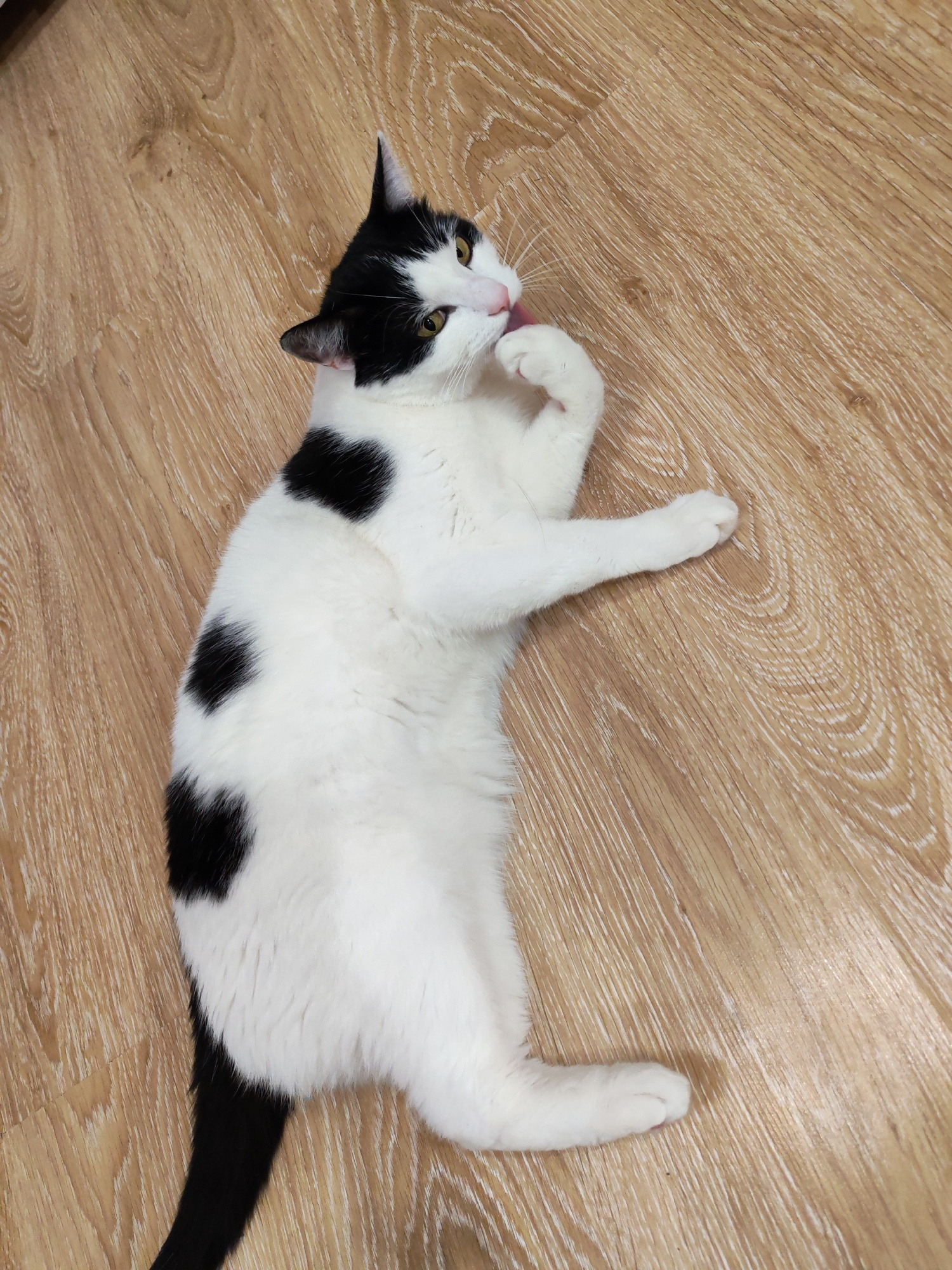 A black and white cat lies on a light brown wood-patterned floor. The cat is mostly white with black spots on its back and head, and a black tail. It is lying on its side, grooming its paw with its to…read more