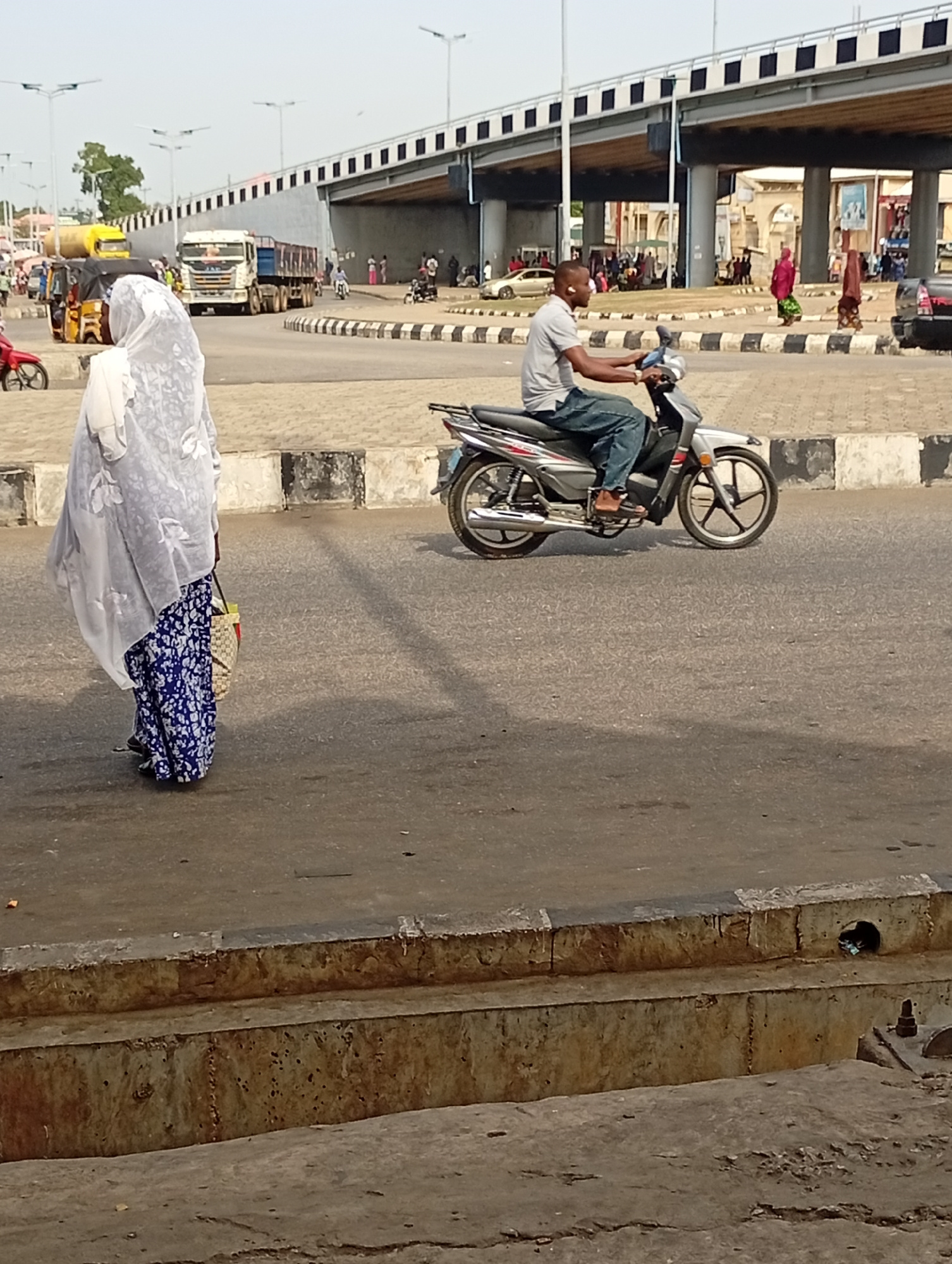 The photo was taken in Lokoja, Nigeria. A woman wearing a white head covering and a long blue floral skirt stands on the side of a road. Next to her is a concrete curb. A man on a silver motorcycle isβ¦read more