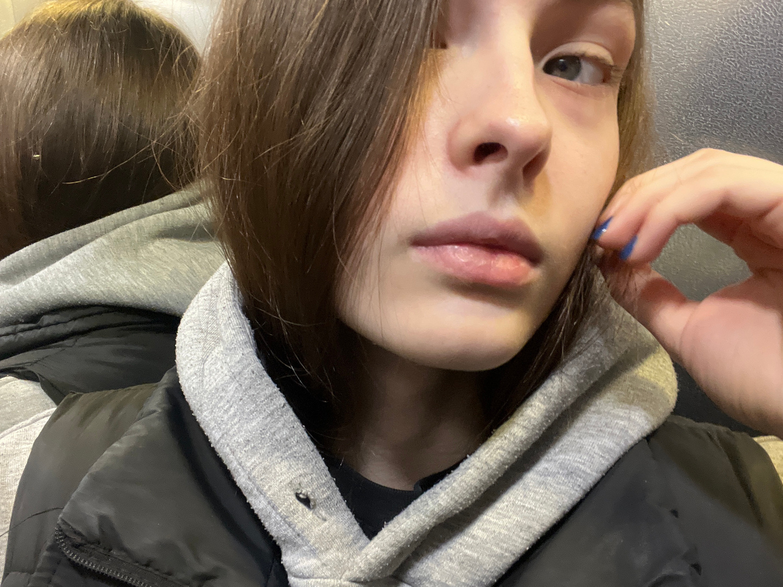 A selfie-style close-up image shows a person's face from an unusual, tilted angle, appearing almost upside down. The person has fair skin and brown hair falling around their face. Their lips are sligh…read more