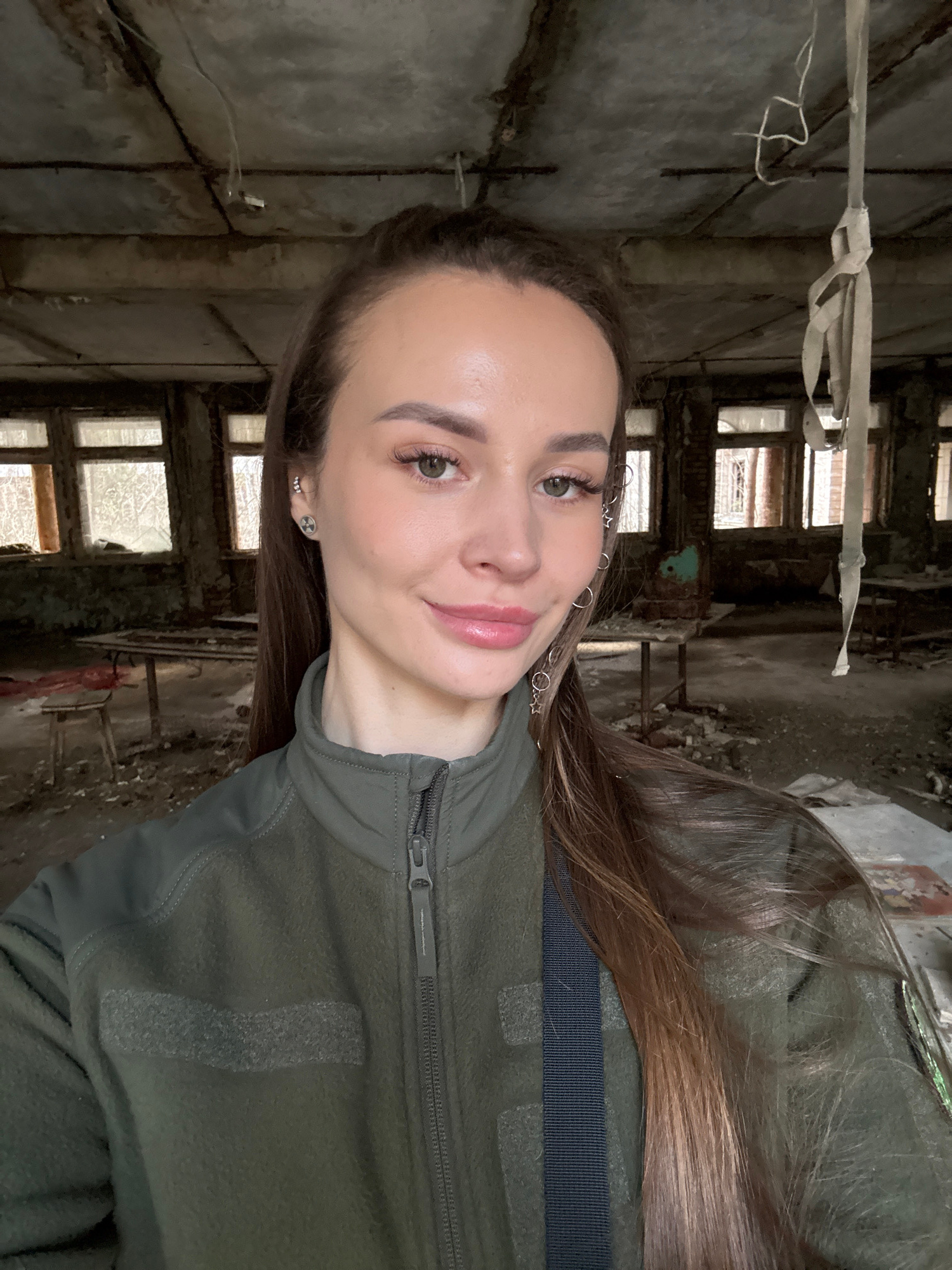 A selfie of a woman in a green fleece jacket, taken indoors in a deteriorated building. The background shows rows of window frames without glass. The concrete walls and ceiling are heavily damaged and…read more