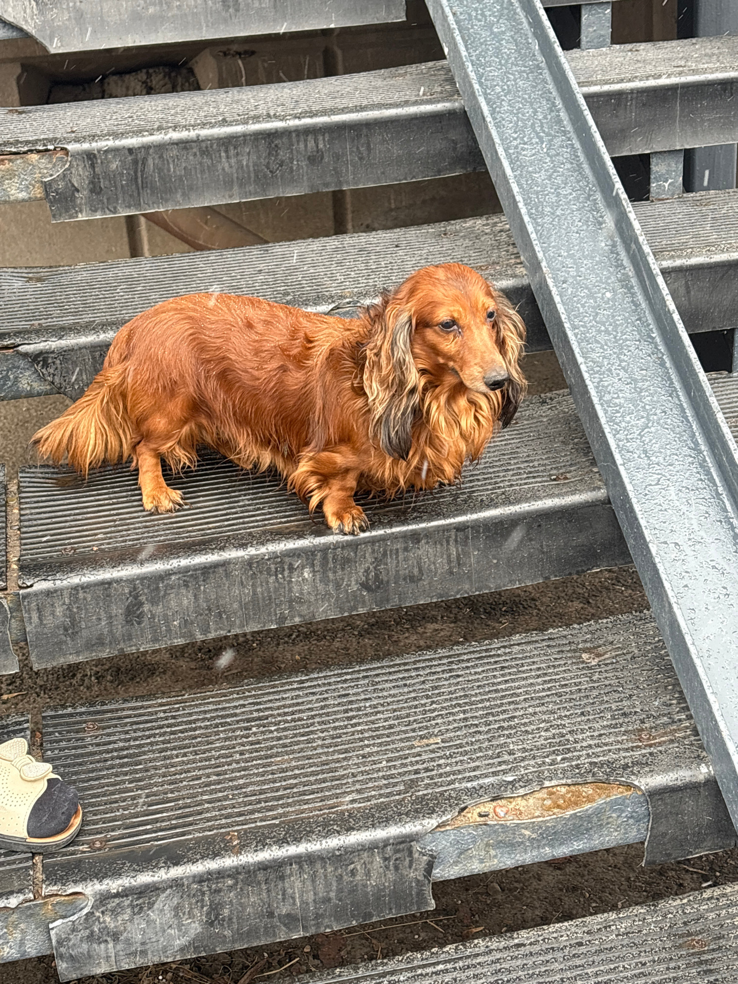 A long-haired dachshund lies on a grey metal grate. The grate is composed of parallel metal strips. A grey metal beam runs along the top of the grate. The dog is light brown with dark brown ears. Theβ¦read more