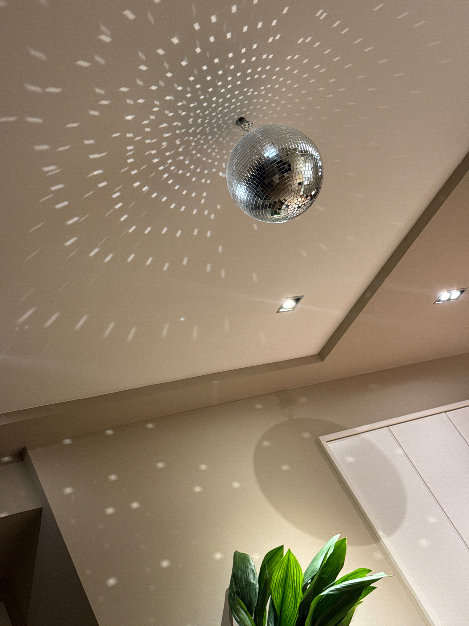 The image shows an interior scene featuring a disco ball suspended near the corner of a wall, reflecting light onto the surrounding surfaces in a pattern of small squares. The walls are light beige an…read more
